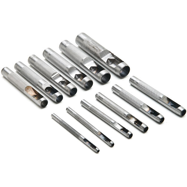 NEW 13pc Hollow Leather Punch Tool Set with Nylon Case. High quality punch set will work on leather, plastic, vinyl, synthetic, gasket material, rubber and also thin foil and brass screen materials. Simply place the punch where you want your hole and hit the top of the tube with a mallet or hammer. Sharp edges leave a clean ready to use hole in almost any material. Each punch tube is heat treated and made from solid steel to keep them sharp for years. Punch has a textured gripping surface for steady holding.