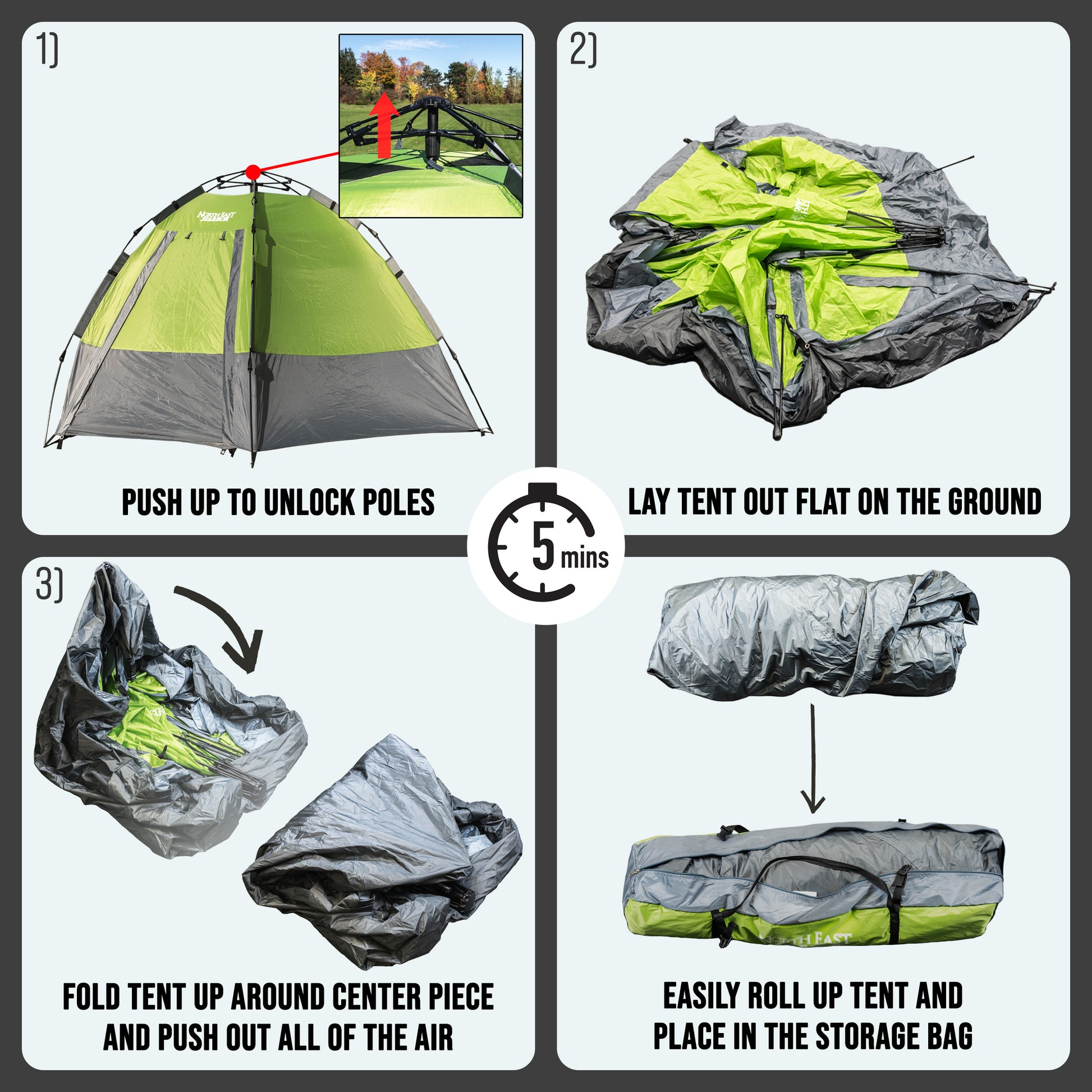 - Instant Automatic Tent Takes Less than a Minute to Setup. First, Lay Out the Main Frame and Straighten Out Poles. Then, Raise the Top Center Piece while Keeping each Pole Separated. Pull Down Axis under the Top Piece to Lock Rods into Place.