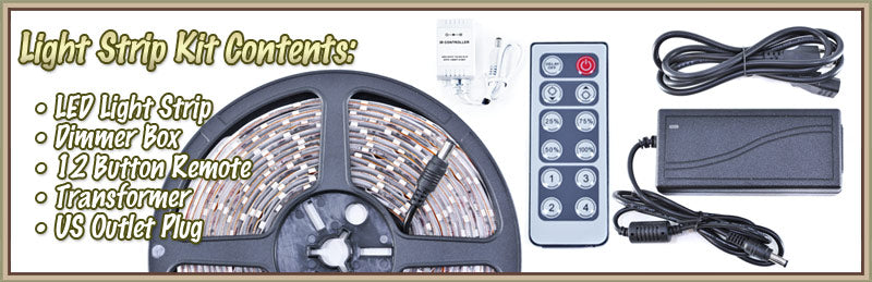 Create the perfect ambiance with this dimmable light strip kit . The 12 Button Wireless Remote lets you have the power to turn the lights ON/OFF, Increase or Decrease the Brightness, or even change them to 1 of 4 custom buttons which can be programmed to the brightness of your liking.