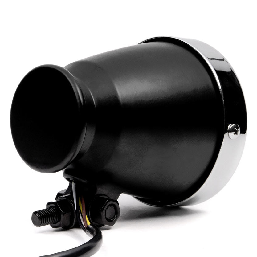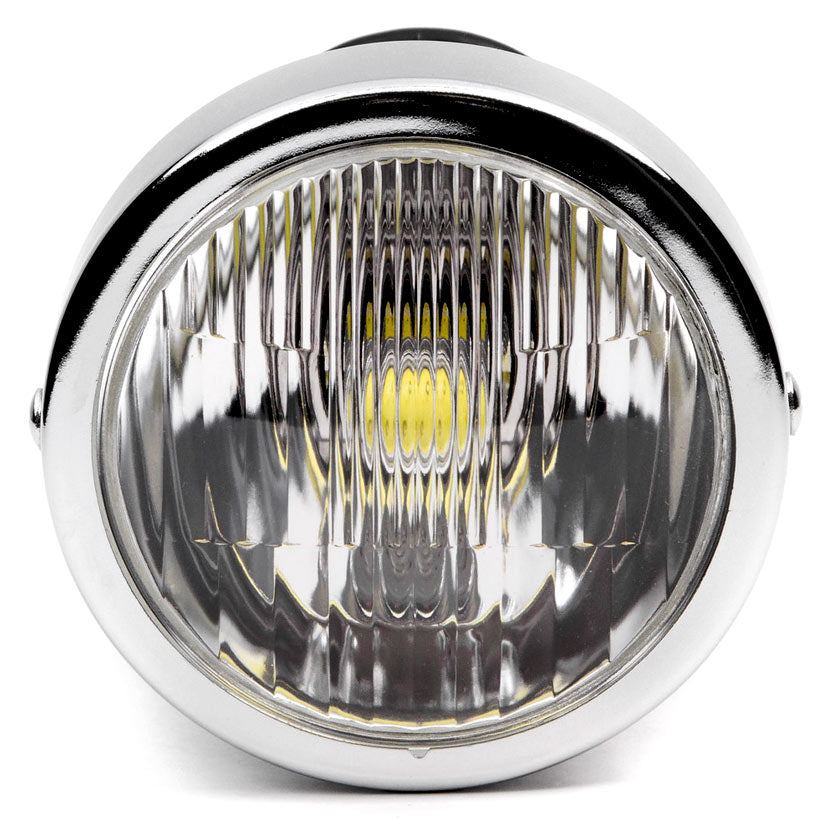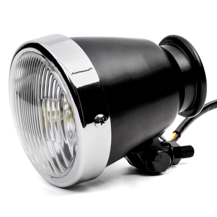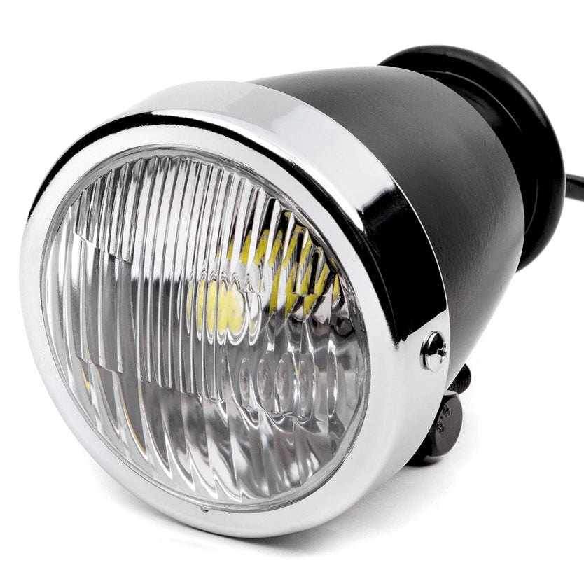 This Mini Headlight features a 4.25" diameter housing with long lasting LED bulb. This is the perfect addition or upgrade to any cruiser, streetbike, bobber, cafe racer, or retro style motorcycle.