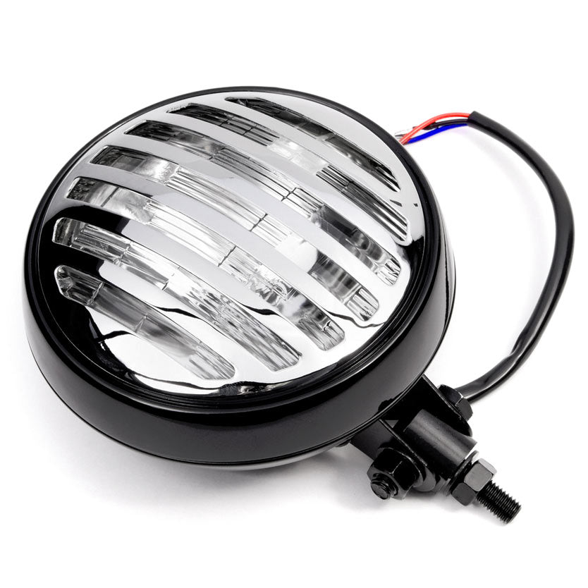 Flat Grilled Headlight features a 6" diameter housing with bright incandescent bulb. This is the perfect addition or upgrade to any cruiser, streetbike, bobber, cafe racer, or retro style motorcycle.