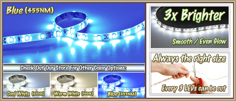 - Super Bright 3528 SMD Blue LED, High Intensity and Reliability, Waterproof Flexible LED Strip