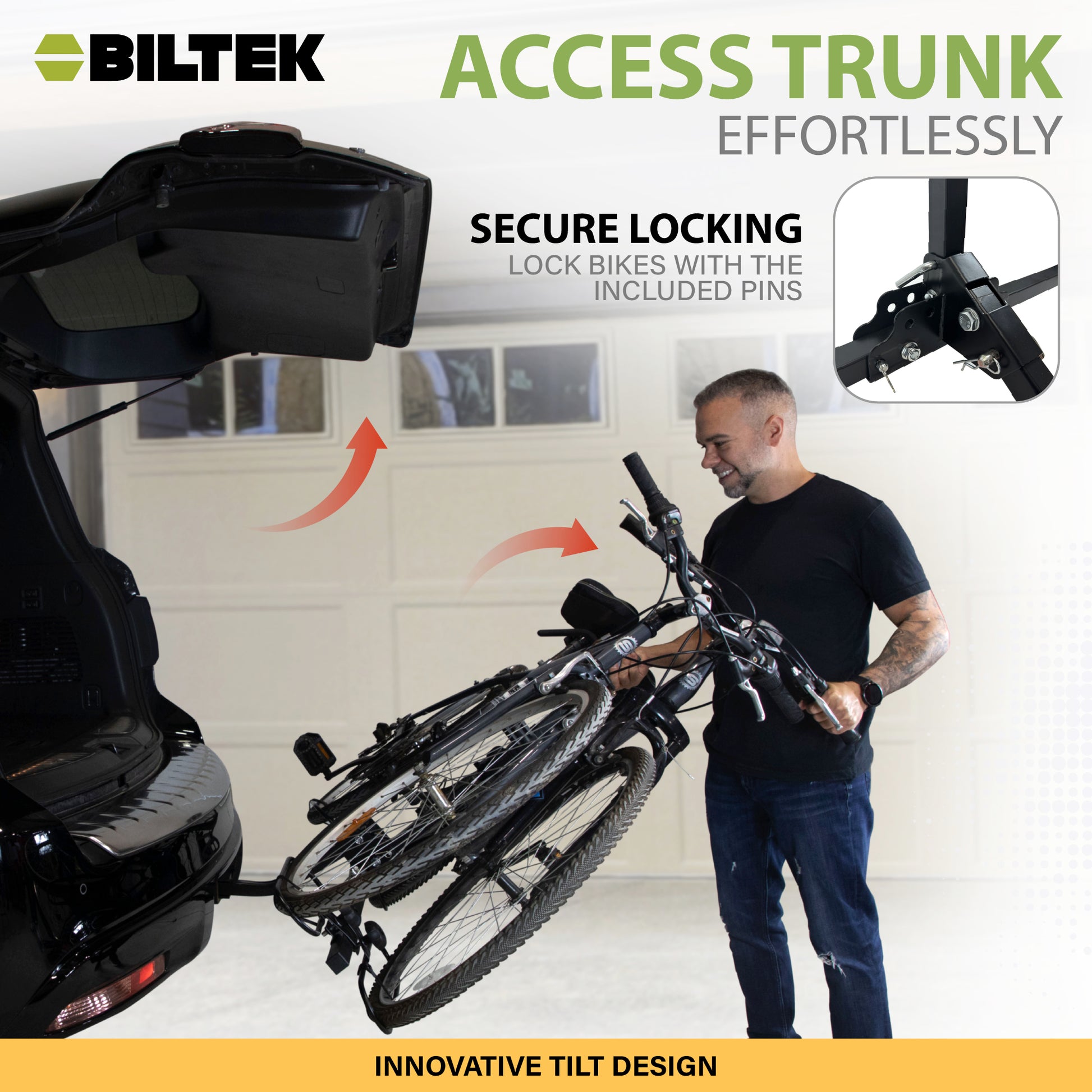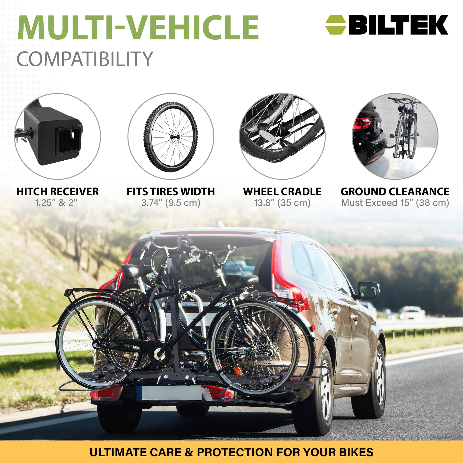 Biltek Hitch Mount Bike Rack, 90 lbs (40 kg) Capacity, Car Bike Rack For 2 Bikes, Tiltable & Foldable, Fits 1.25" & 2" Hitch, Includes 6 Extra Straps, 2 Bike Rack For SUV, Cars, Truck, Minivan & Sedan