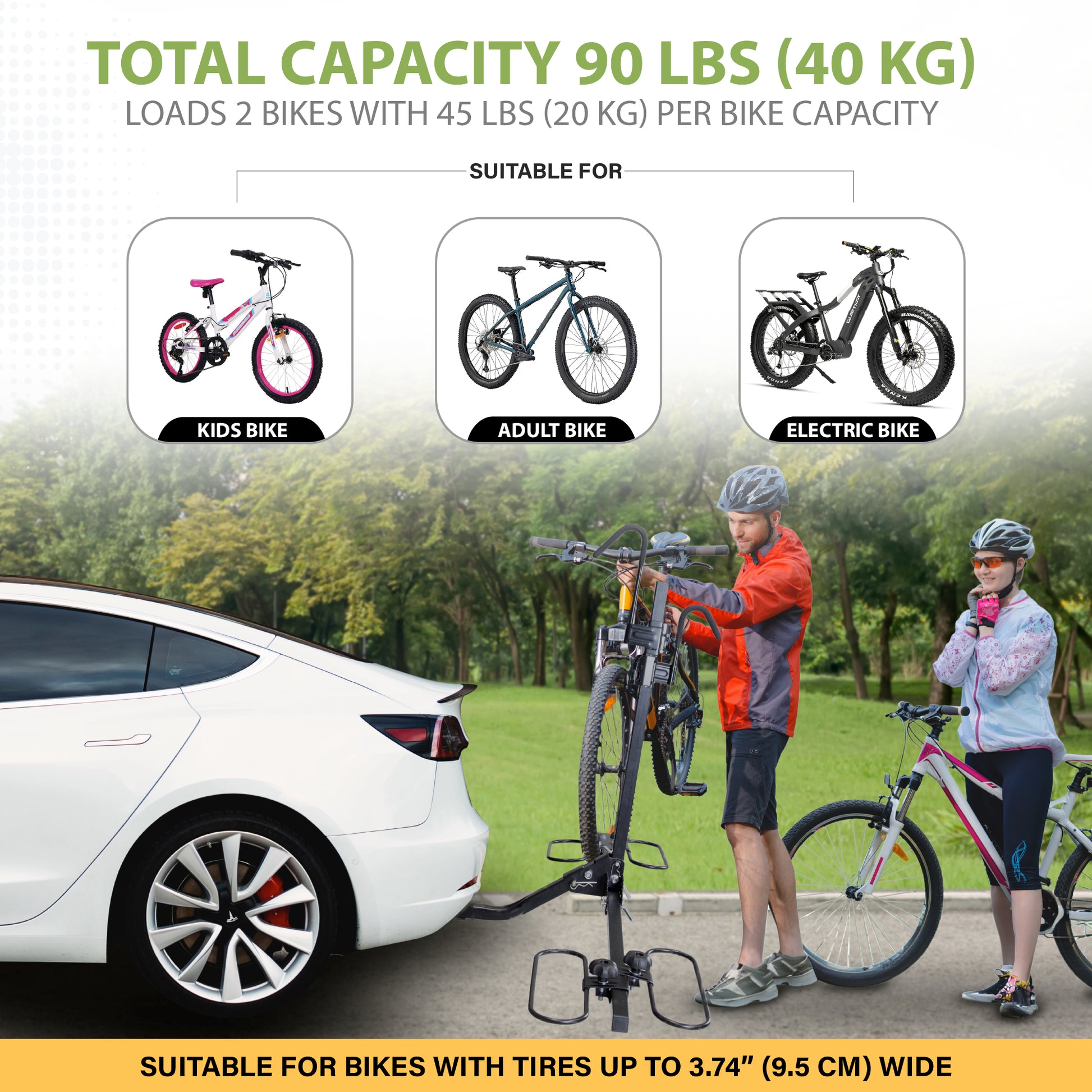 - [2 BIKE CAPACITY, MULTI-VEHICLE COMPATIBILITY] - This bike rack for car carries 1 or 2 bikes, with capacity of up to 90 lbs (45 lbs per bike). The adjustable cradle carries wheel sizes from 20"-26" (50.8 - 66 cm), making it the ideal choice for car bike racks for 2 bikes. The bike rack is compatible with 1.25" (3.2 cm) & 2" (5 cm) hitch receivers. This versatile bike rack for car hitch is suitable for use as a bike carrier for car, bike rack for SUV, bike rack for truck & bike rack for sedan.