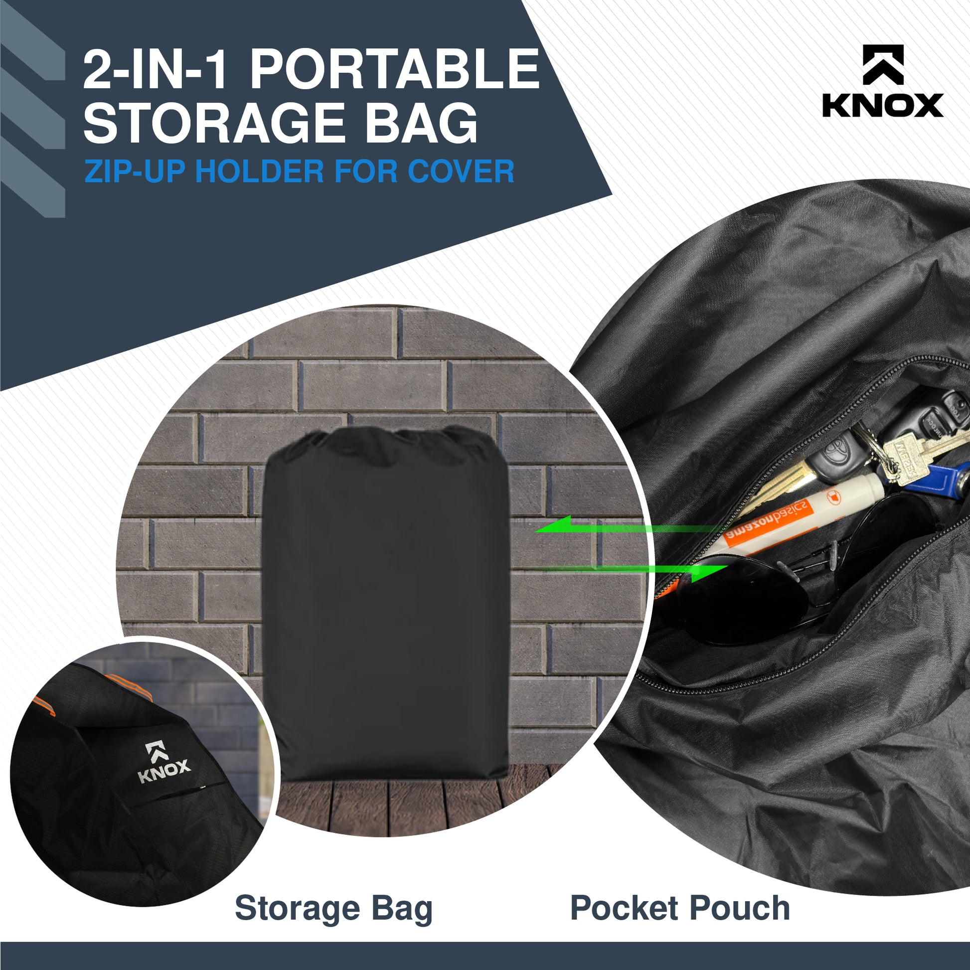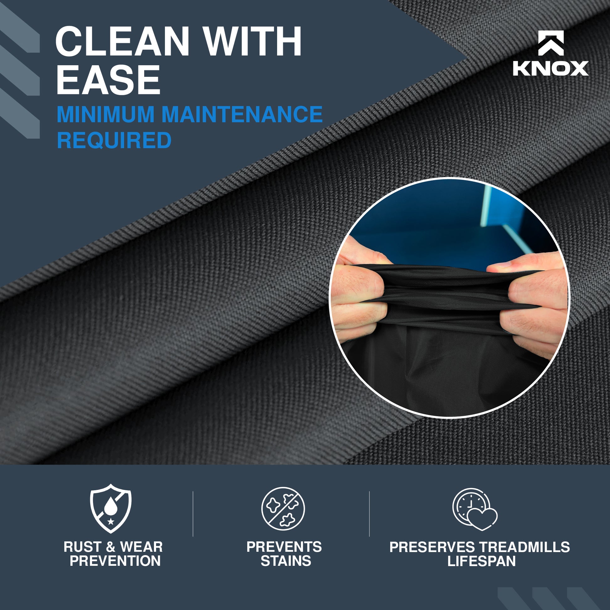 - [PORTABLE DESIGN & EASY TO CLEAN] - Experience the convenience of KNOX's treadmill cover waterproof outdoor, featuring a handy zip-up storage pouch. This 2-in-1 design gives you the option to store the outdoor treadmill cover with ease & take it anywhere you go. Plus, you can use it as a pocket carrier while the cover is on, offering ample space to store your belongings. Maintaining cleanliness for the treadmill cover dustproof is effortless with a quick wipe-down using a damp cloth.