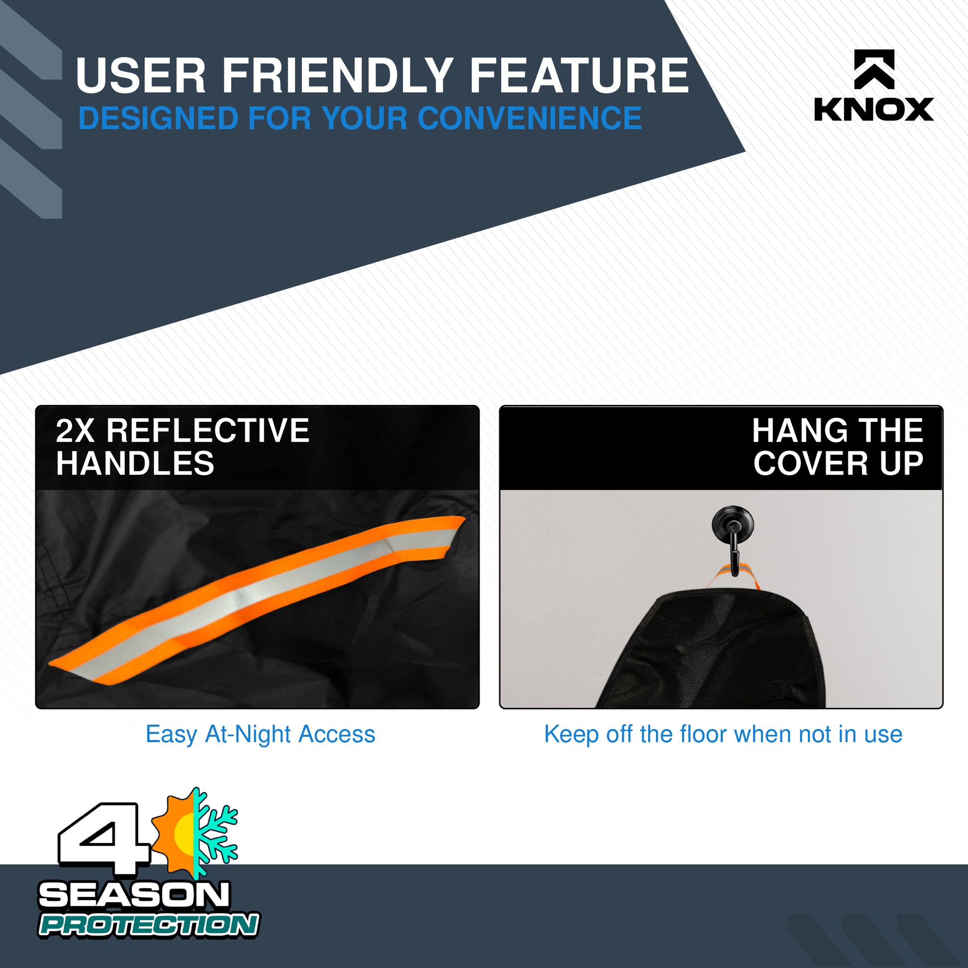 - [USER-FRIENDLY & SECURE DESIGN] - KNOX treadmill protective cover features a strong double-stitched elastic bottom hem for a secure, snug fit. Designed for convenience, these lightweight running machine covers include two reflective handles positioned side by side. This makes it easy to see where to take hold of the cover and effortlessly slip it off at night time when there's limited visibility. Perfect for those seeking reliable treadmill accessories.