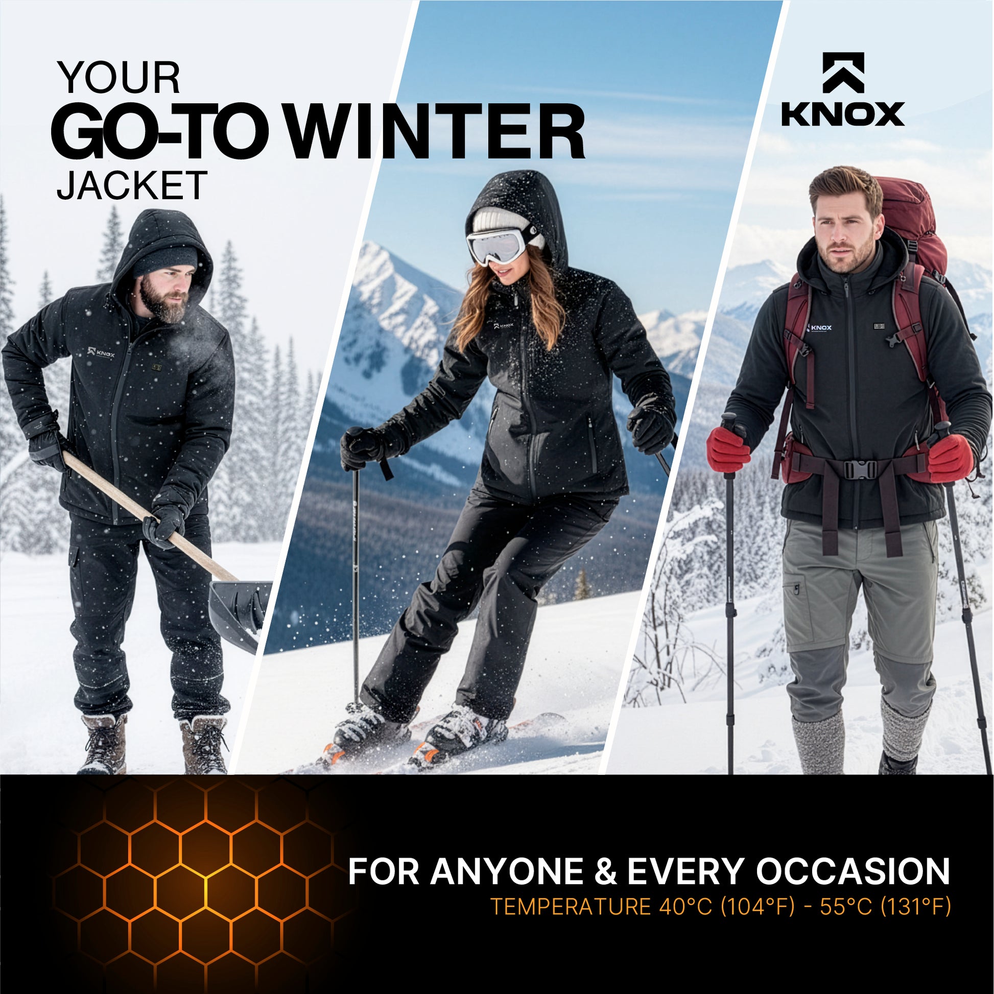 - [4 TARGETED HEATING ZONES FOR FULL-BODY WARMTH] - KNOX Heated Jacket delivers fast, consistent heat through four 40% larger carbon-fiber heating zones - two on the abdomen, one on the back, and one on the neck. Enjoy full-core warmth that activates in seconds and stays steady in freezing temperatures. Perfect for commutes, outdoor work, camping, hiking, skiing, and harsh Canadian winters.