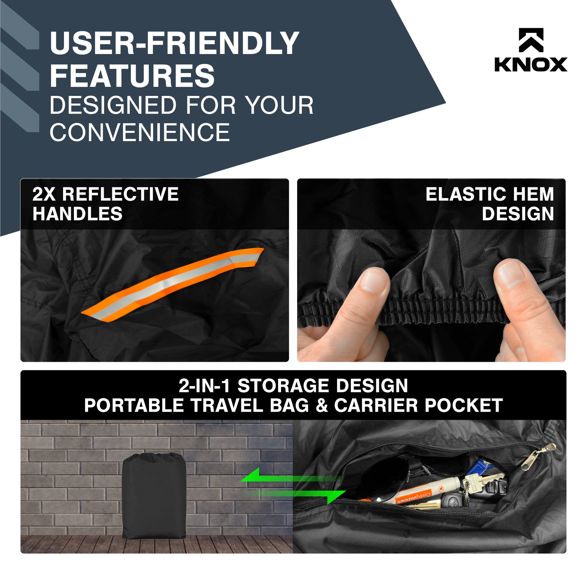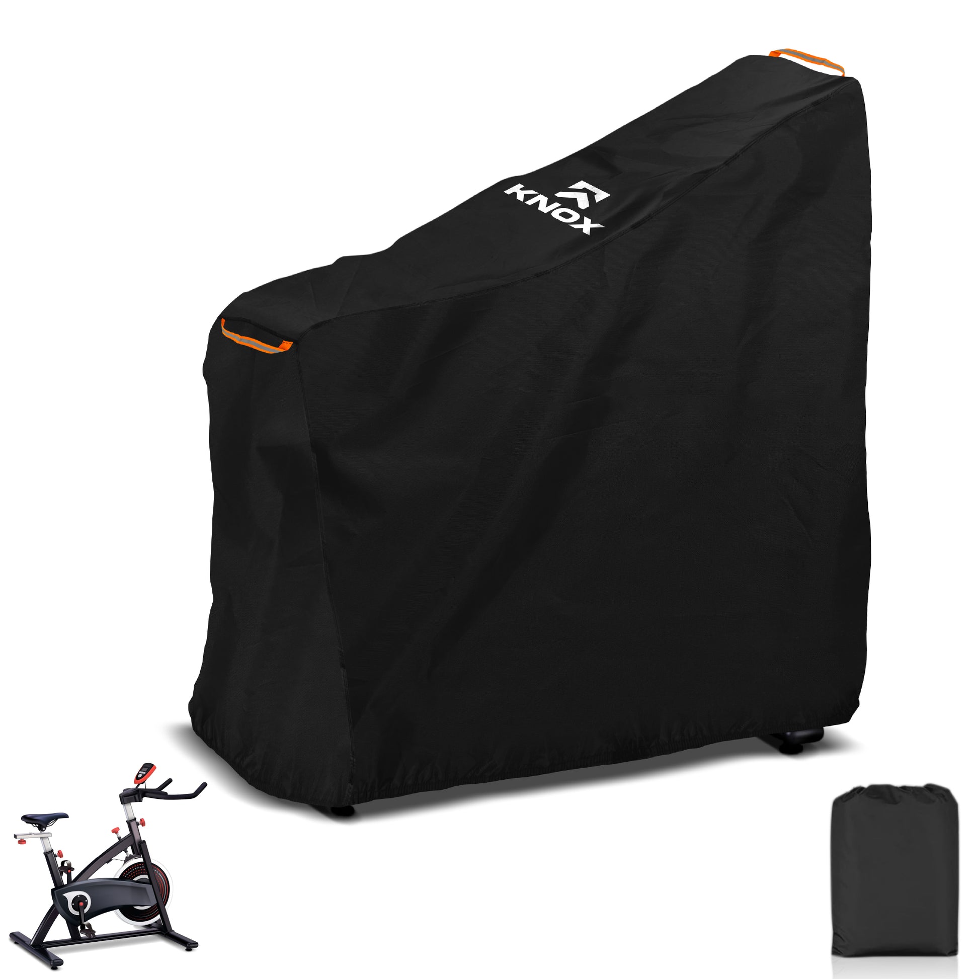 - [USER-FRIENDLY & SECURE DESIGN] - KNOX stationary bike covers feature a durable double-stitched elastic bottom hem for a secure and snug fit. For added convenience, we've designed these lightweight outdoor gym bike covers with two reflective handles���one on the front and one on the back. This makes it easy to see where to take hold of the cover and effortlessly slip it off at night time when there's limited visibility. Perfect for those seeking reliable stationary exercise bike accessories.