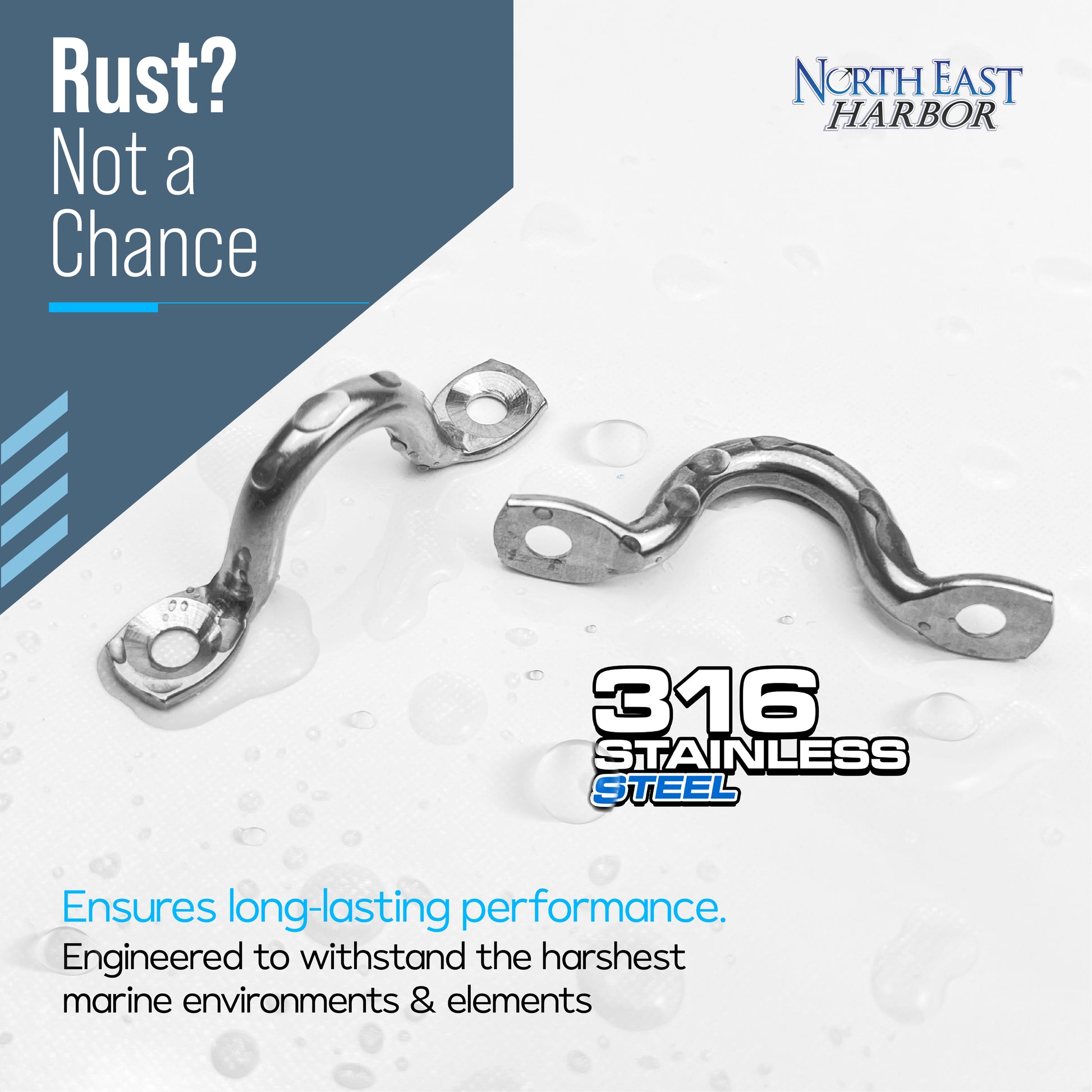 - [RUST? NOT A CHANCE: FORTIFIED WITH 316 STAINLESS STEEL] Introducing our extraordinary boat deck loop eye, meticulously crafted from mirror-polished, premium 316 Stainless Steel. Our Bimini top hardware is designed with rust and corrosion-free metal to resist the most extreme sea situations, keeping your Bimini sun shade at tip-top condition.