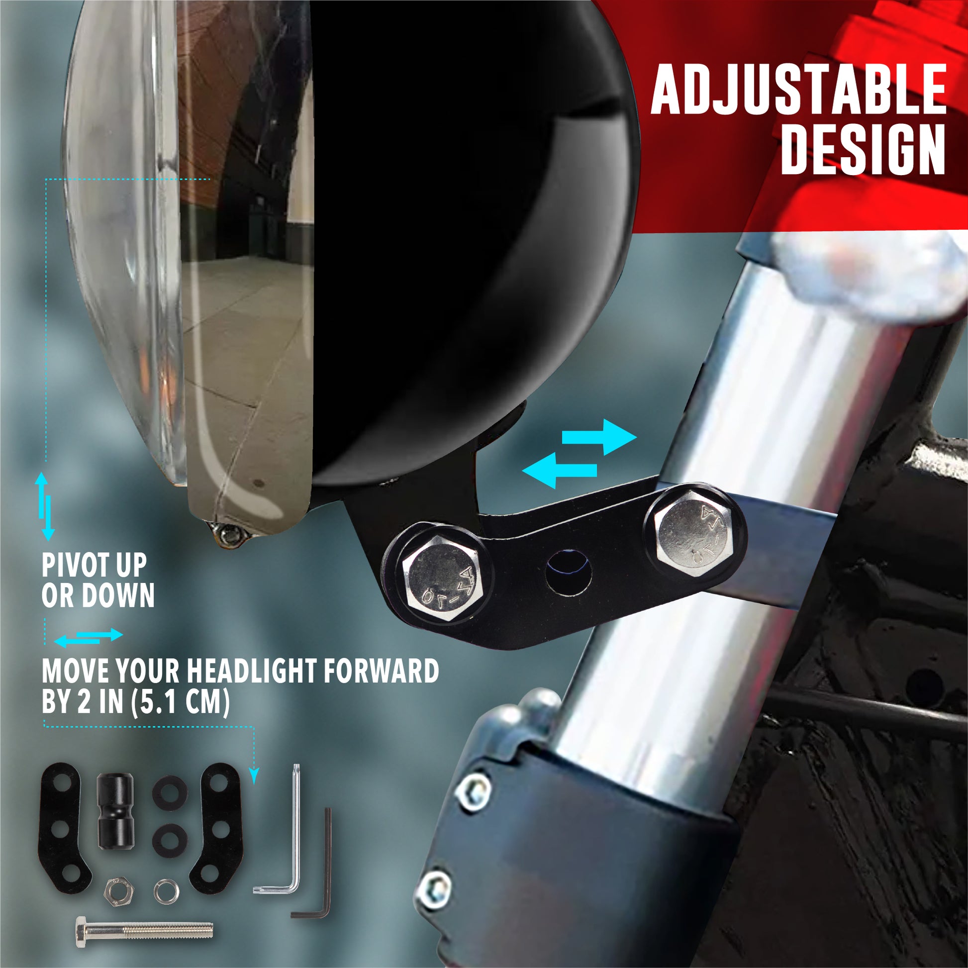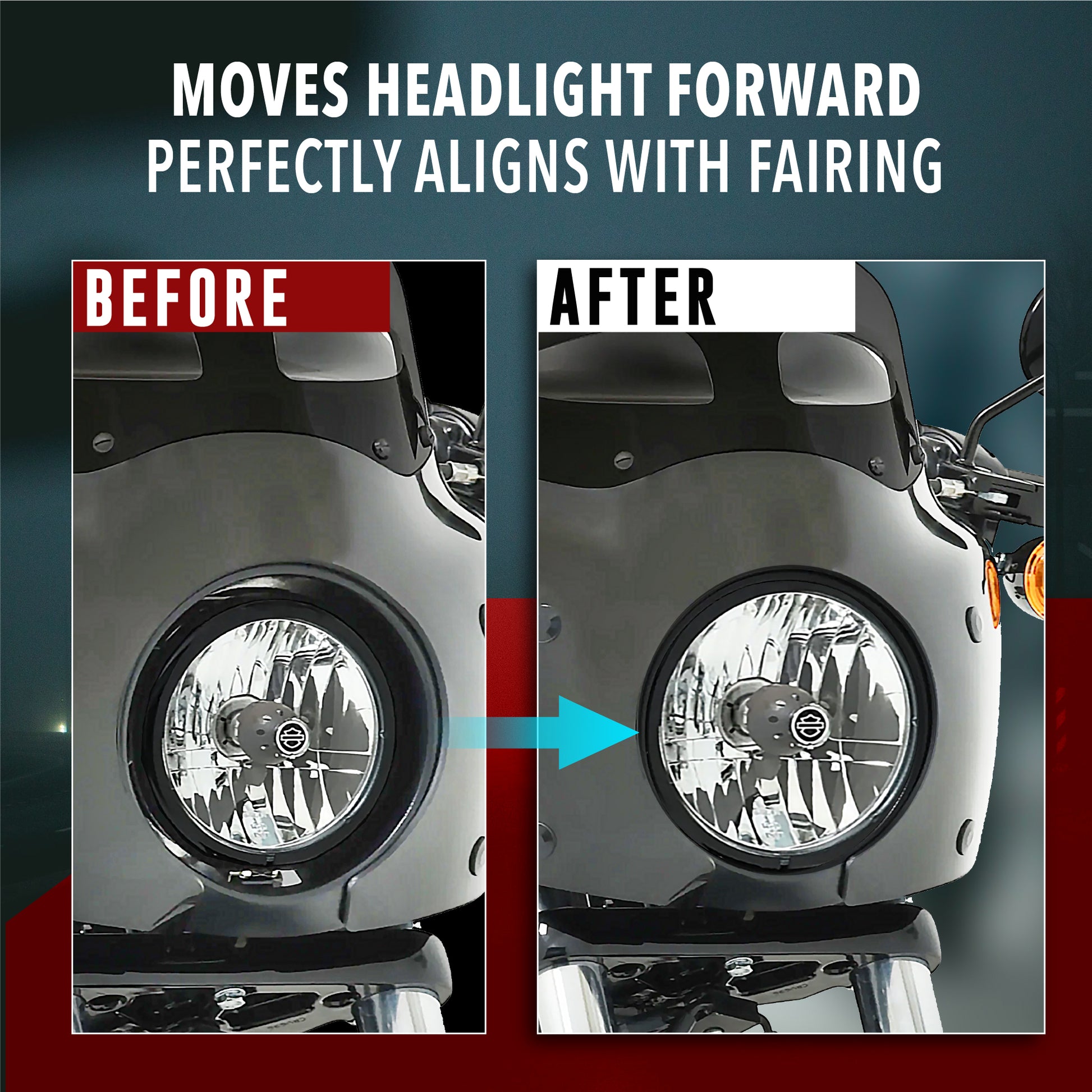 - [ALIGNS HEADLIGHT WITH FAIRING] - The headlight extension block comes with multiple mounting points allowing you to easily shift the headlight forward in the fairing bezels, ensuring proper alignment with your headlight fairing. This accessory enhances your bike's appearance by offering a better-positioned fairing. Compatible with Harley Sportster fairing and Harley headlight fairing, this block enables adjustable tilting of the headlight upwards & downwards, as well as 2-inches forward.