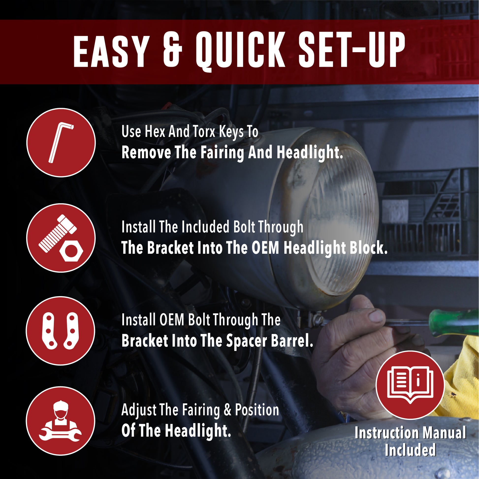 - [QUICK AND EASY SETUP] - Effortlessly install the headlight extension block onto your motorcycle headlight bracket & fairing quickly. Krator's headlight extension block includes an instruction manual, ensuring you're ready to modify your fairing quickly. The headlight block for Krator fairing is equipped with all the necessary nuts, bolts, & accessories for a swift installation. Krator's headlight block lets you hit the road with upgraded style in no time.