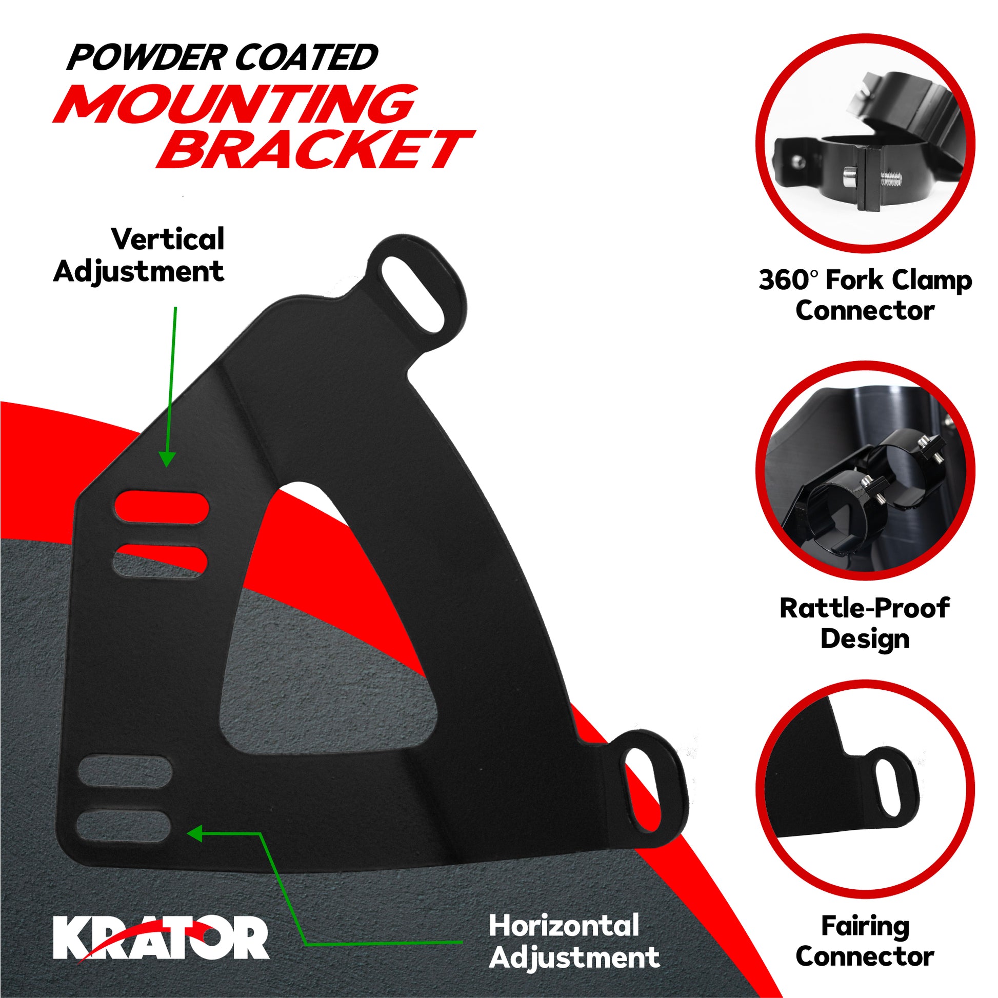 - [RATTLE-PROOF DETACHABLE DESIGN] - The Krator motorcycle headlight fairing ensures a steady and vibration-free experience. It comes included with two upgraded headlight fairing brackets and four fork clamps, firmly anchoring the fairing to your motorcycle forks. Achieve an ideal fit with convenient vertical and horizontal adjustments. Effortlessly mount or disassemble the motorcycle fairing using this unique detachable design for added convenience.