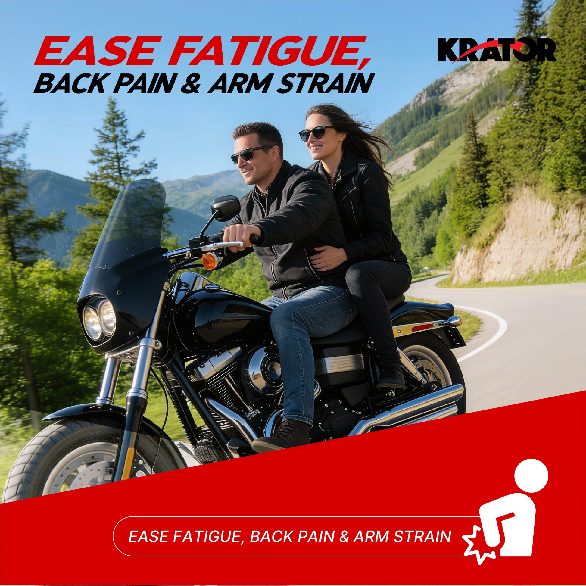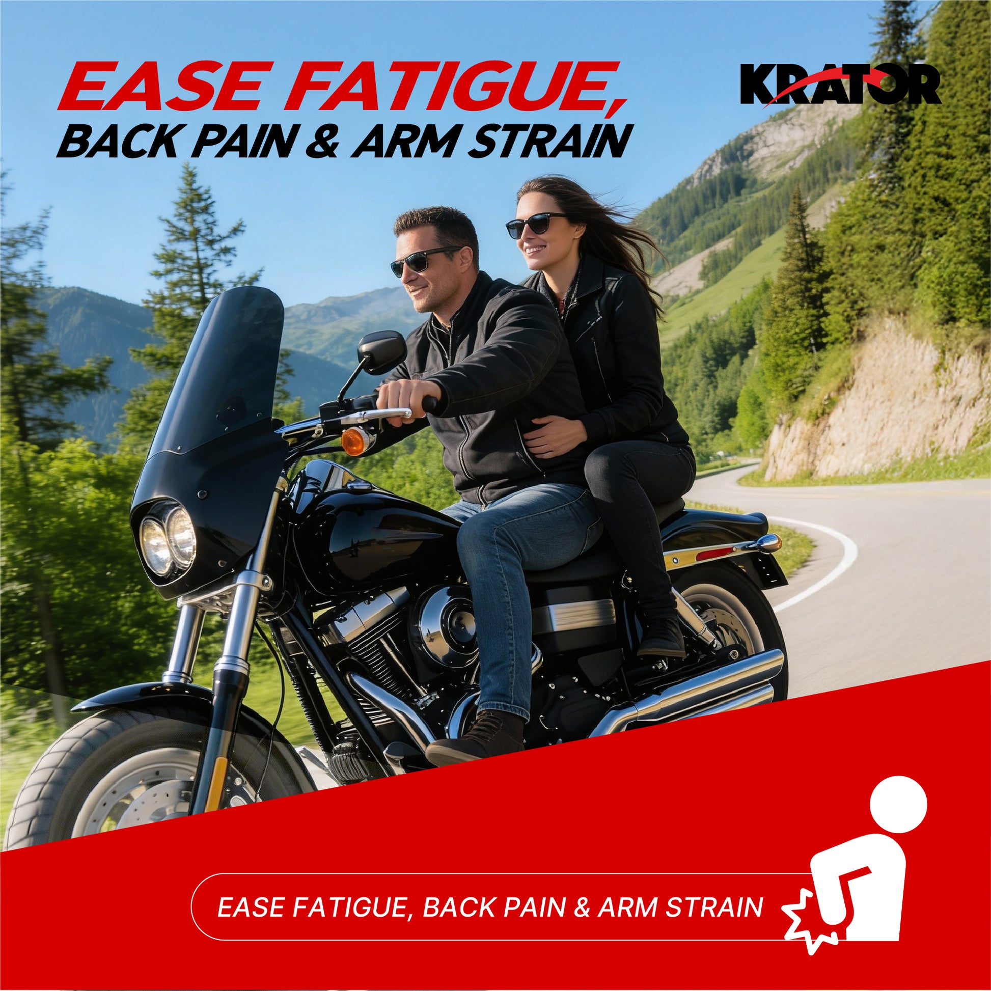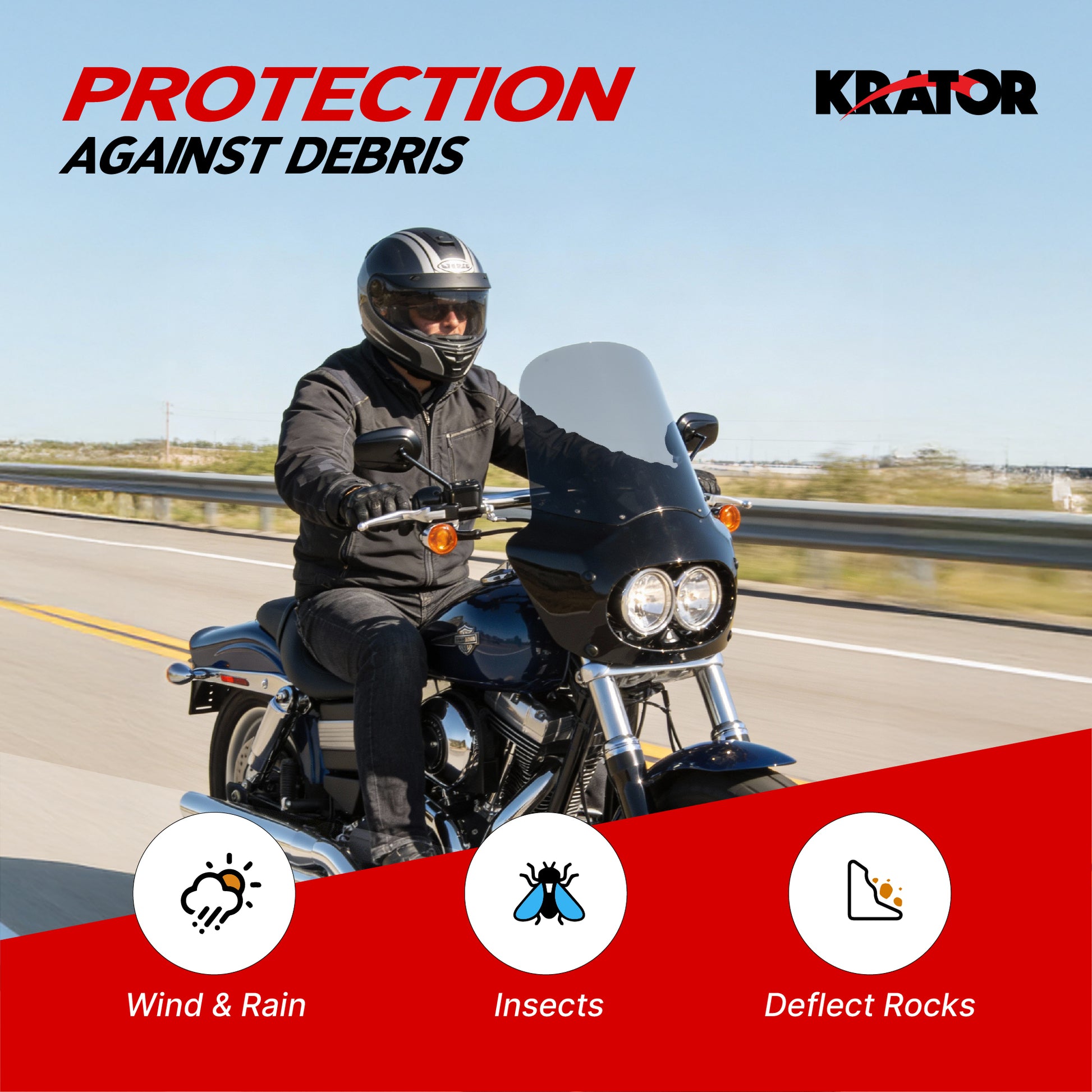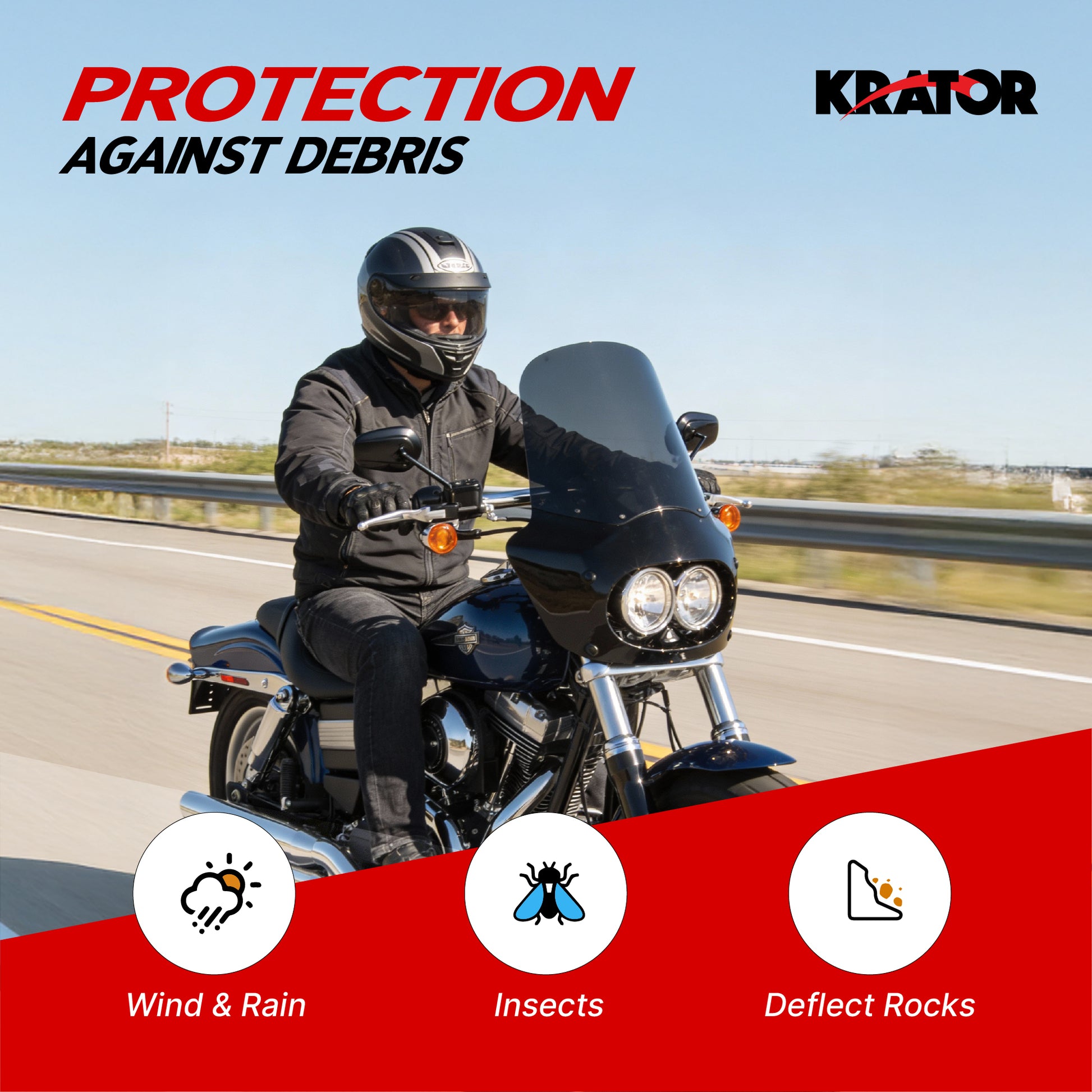 - [HELPS REDUCE WIND PRESSURE AND IMPROVE COMFORT] Krator fairing windshield are shaped to redirect airflow away from your chest and upper body, which helps reduce the constant wind pressure you experience at cruising and highway speeds. By limiting direct wind impact, this setup supports a more relaxed feel on longer rides and helps you stay comfortable while maintaining better control and focus during everyday riding.