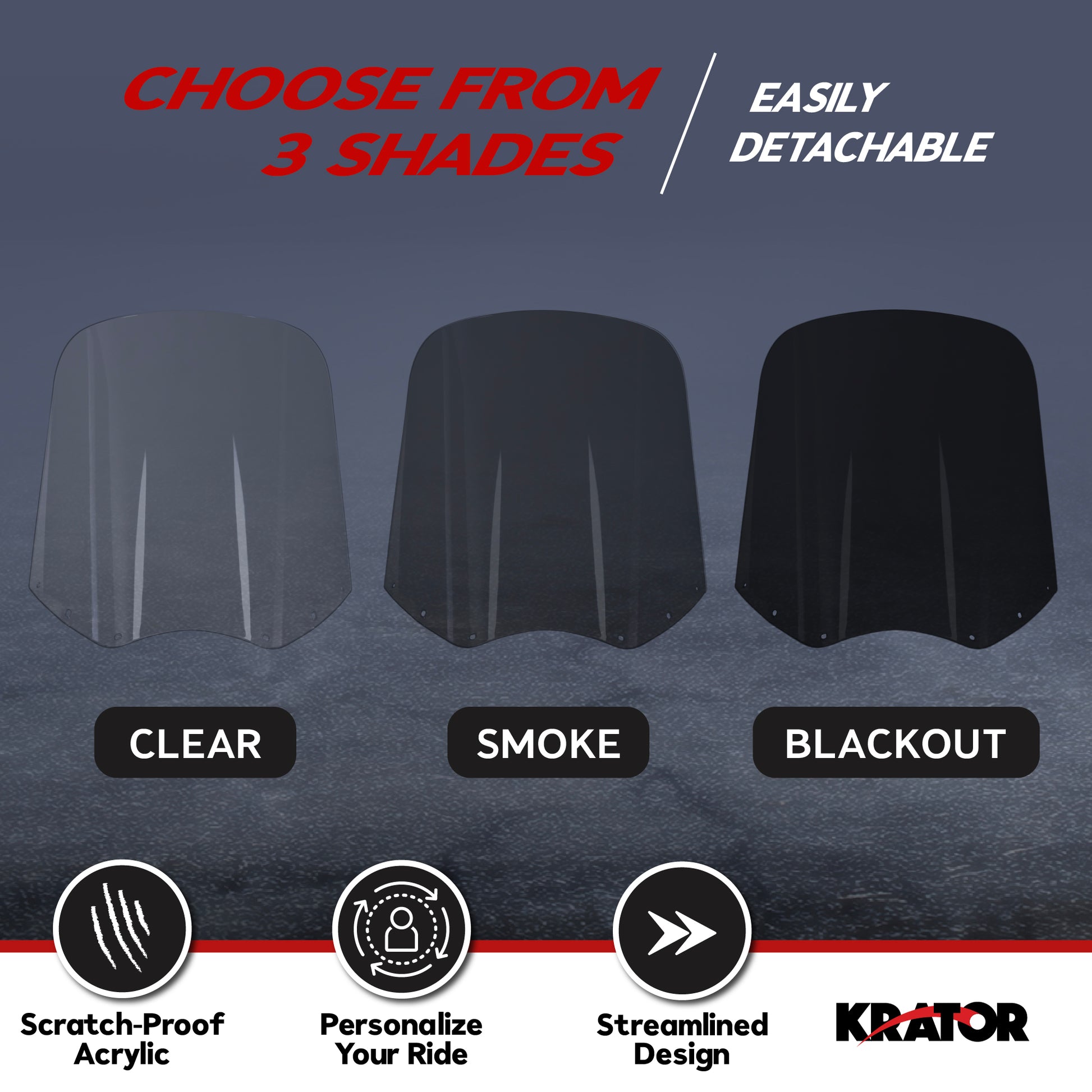 - [WINDSHIELD REPLACEMENT SOLUTION] - Replace your damaged motorcycle windshield and upgrade your Krator fairing with our new windshield. Krator windshields are available in three shades: Clear, Smoke, and Blackout, offering a simple way to refresh the look of your bike.