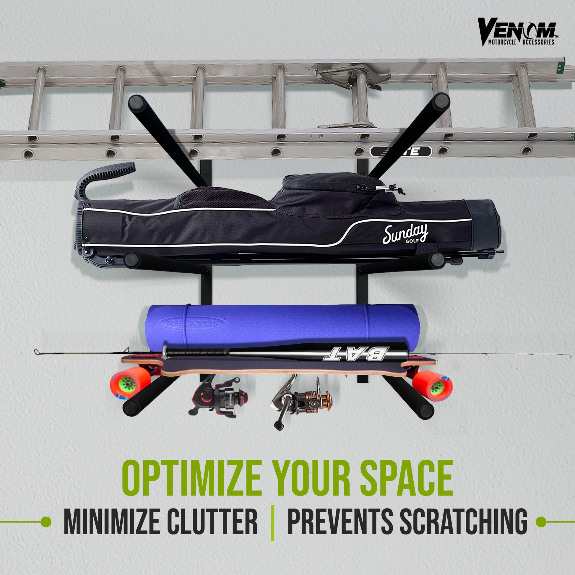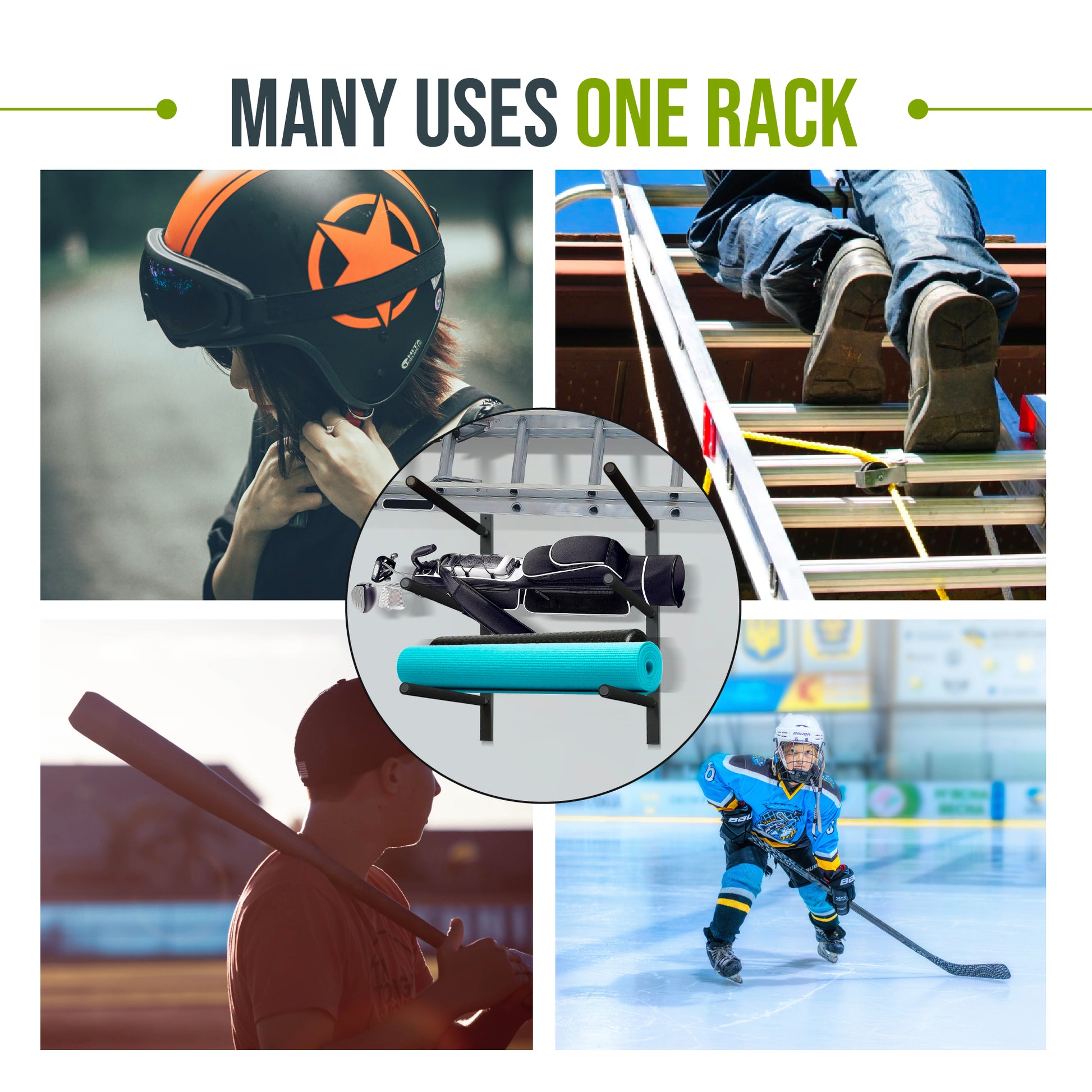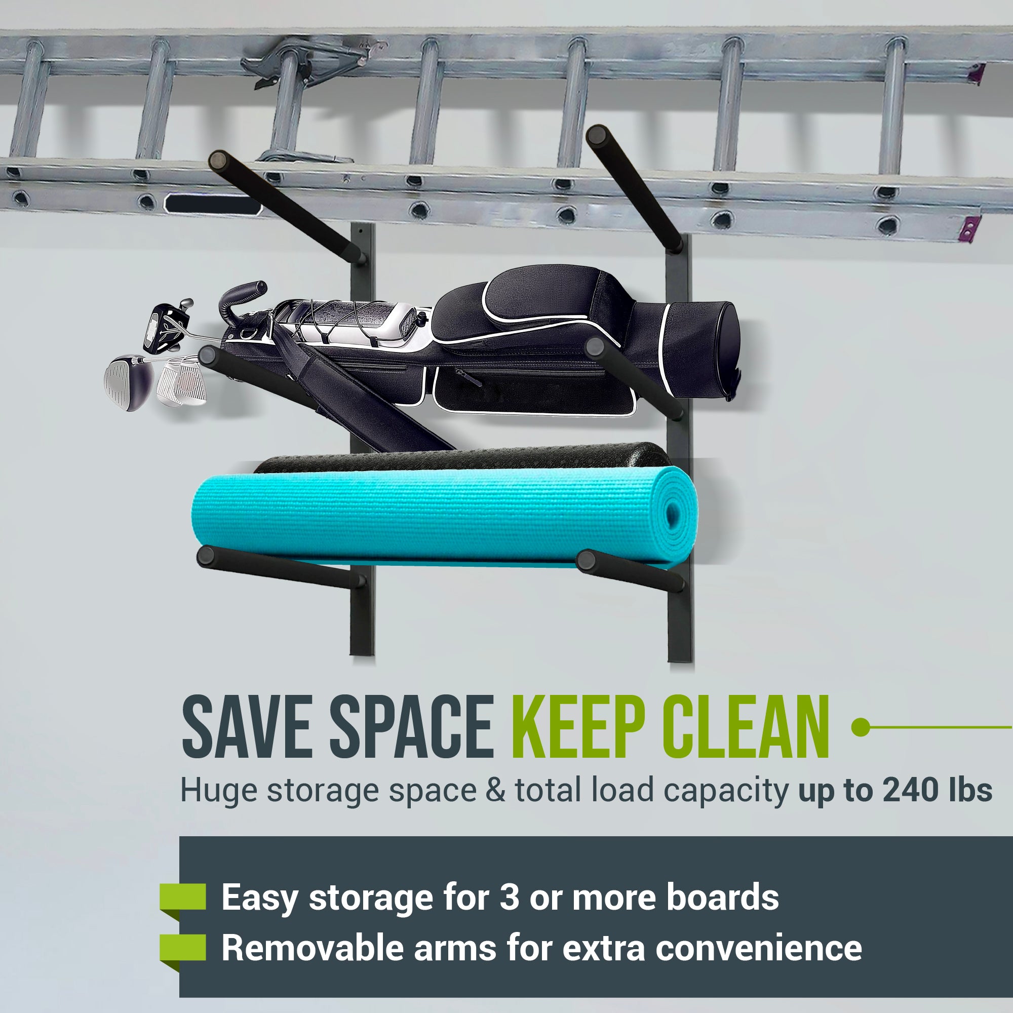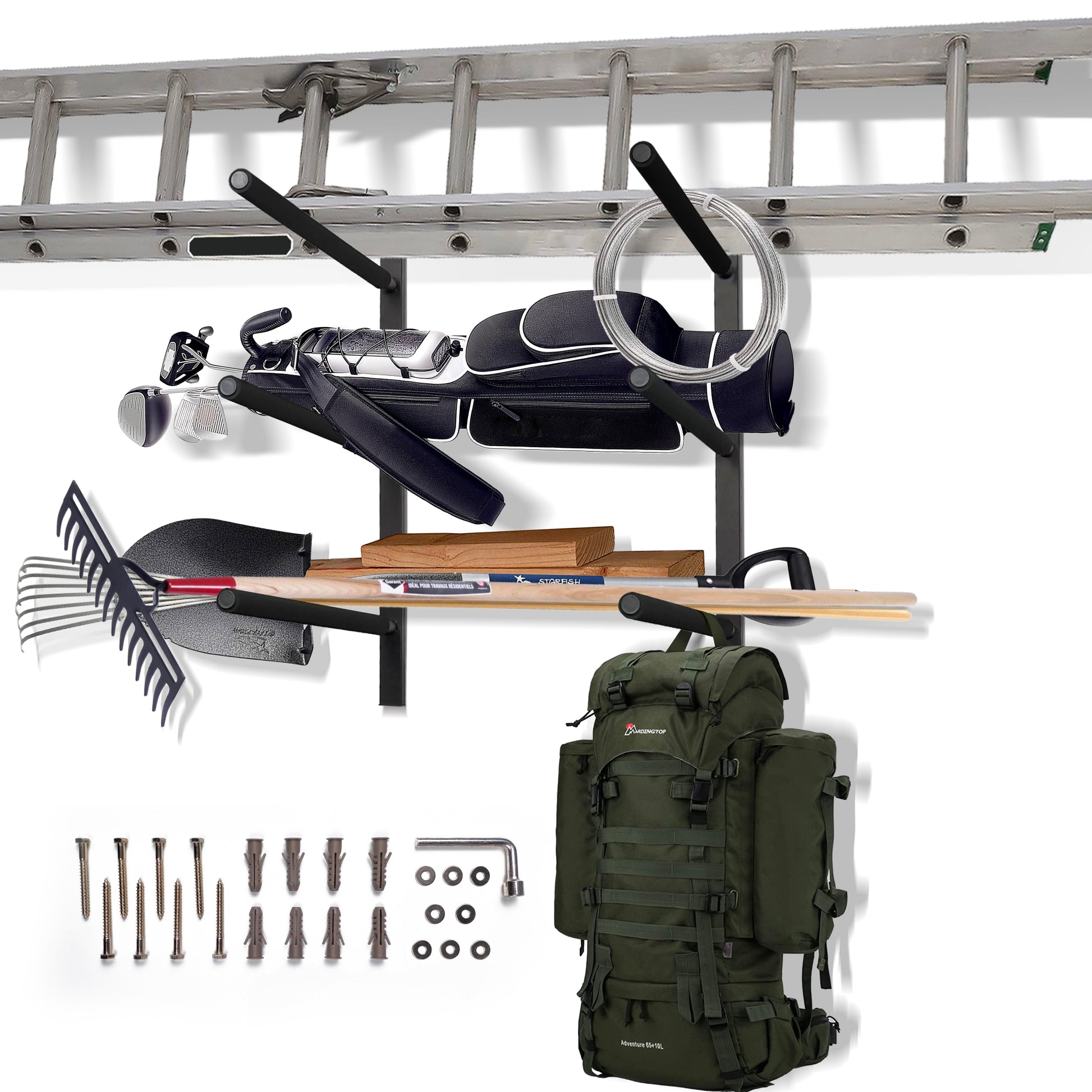 - [MULTI-FUNCTIONAL STORAGE RACK] Versatile Heavy Duty Storage Shelves That Can Be Used to Store Ladders, Lumber, Luggage, Building Materials, Hockey Sticks, Chairs, and More! You Can Also Hang Your Helmets, EV Charging Cables, Golf Bags, etc. on the Arms. The Most Multi-Utility Garage Organization Rack on the Market!