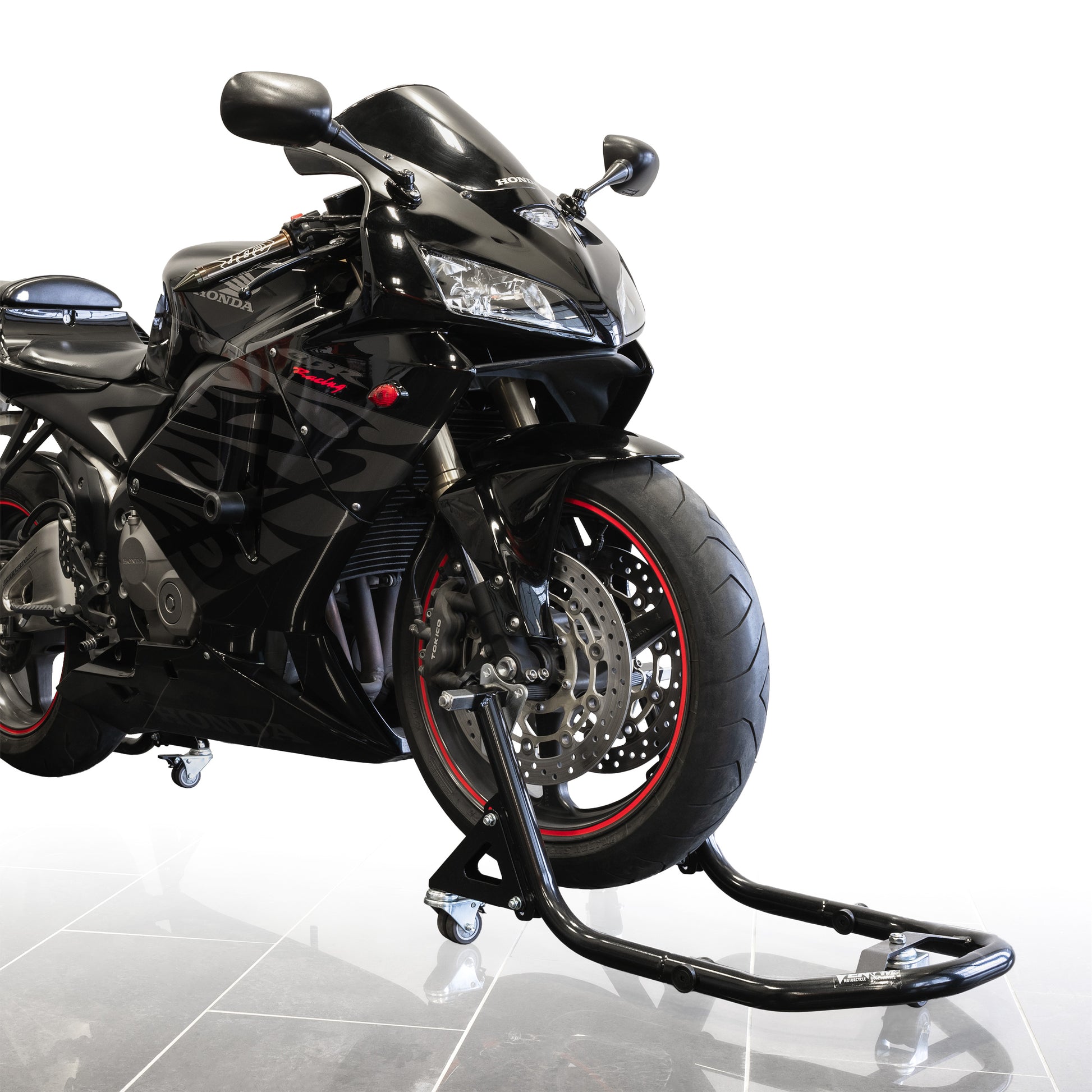 The front lift stand allows for easy and safe lifting of the motorcycle for repair,