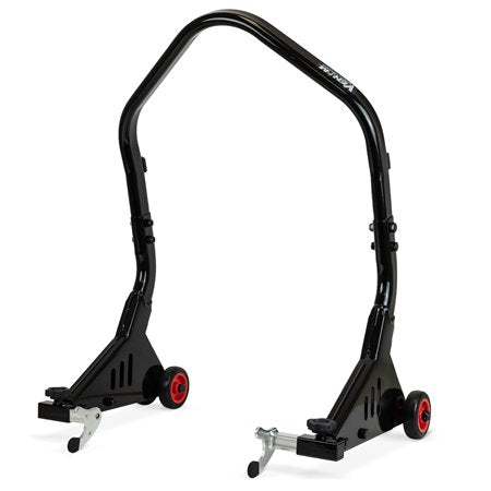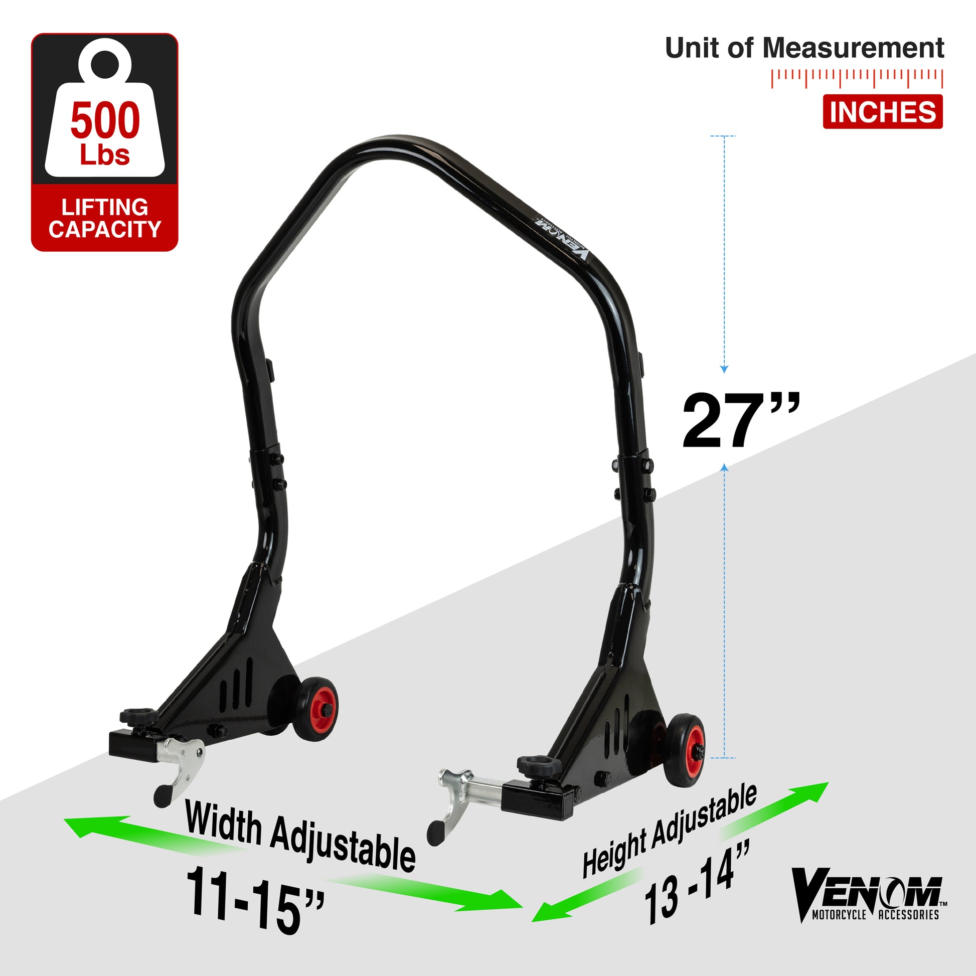 - [NEWEST DESIGN V3.0 - "YOU ASKED, WE LISTENED"] - Venom has engineered this stand with the voice of the customer. An upgraded design featuring; a patent-pending triangle brace, an increased weight capacity, zero wobble, adjustable height, dual locking bolts, wide handles, oval tubes, and polypropylene caster wheels. This motorcycle rear spool stand sets a new standard in performance and functionality.
