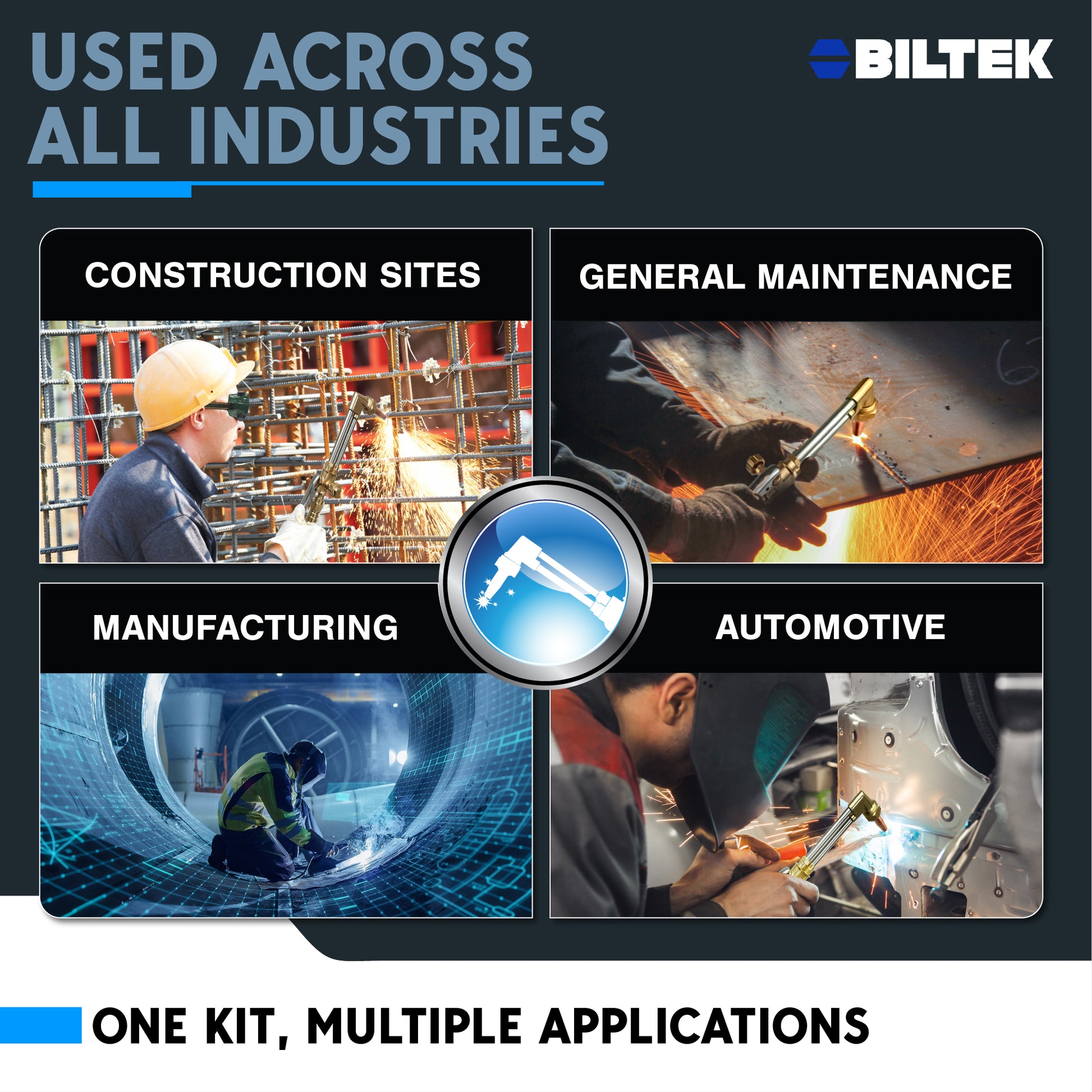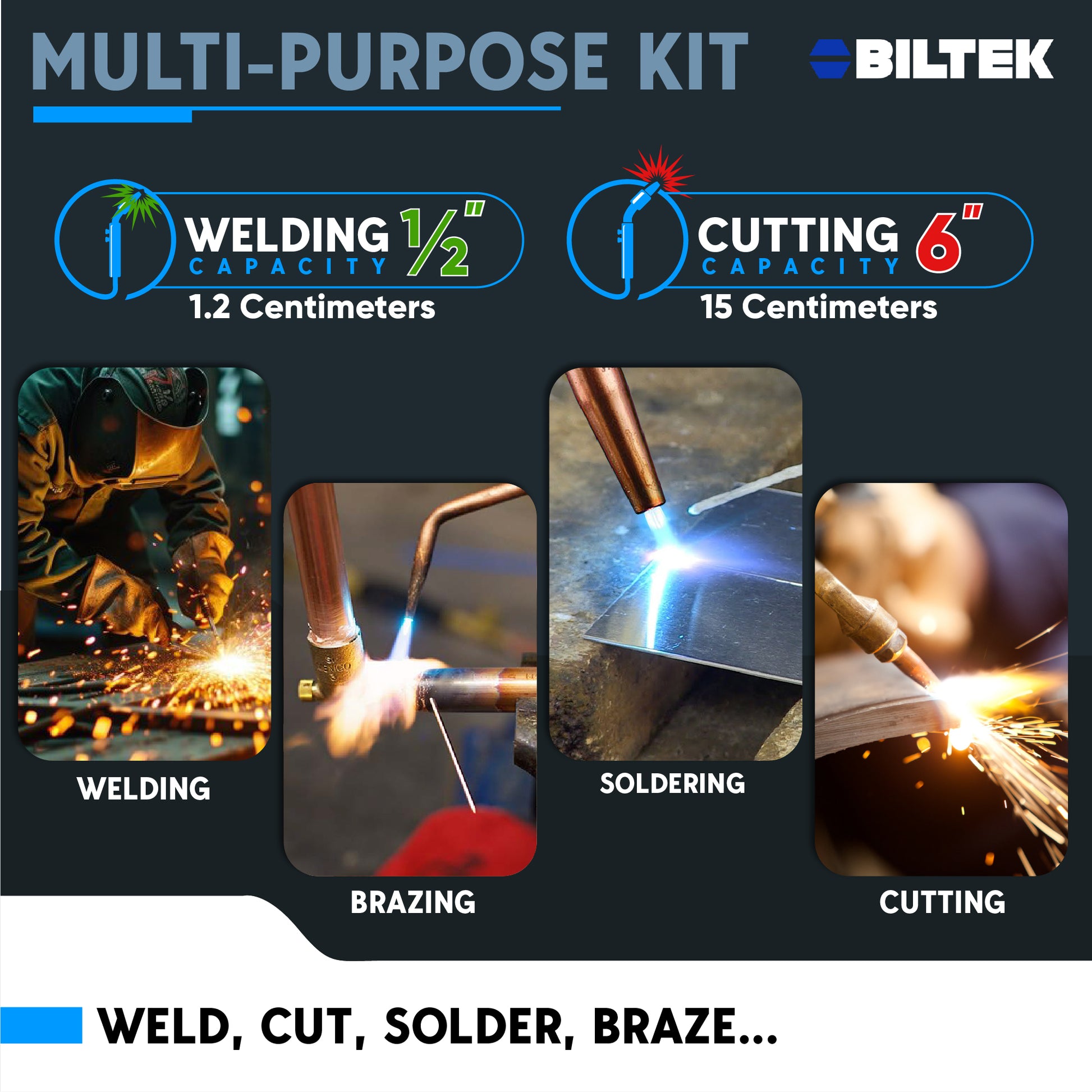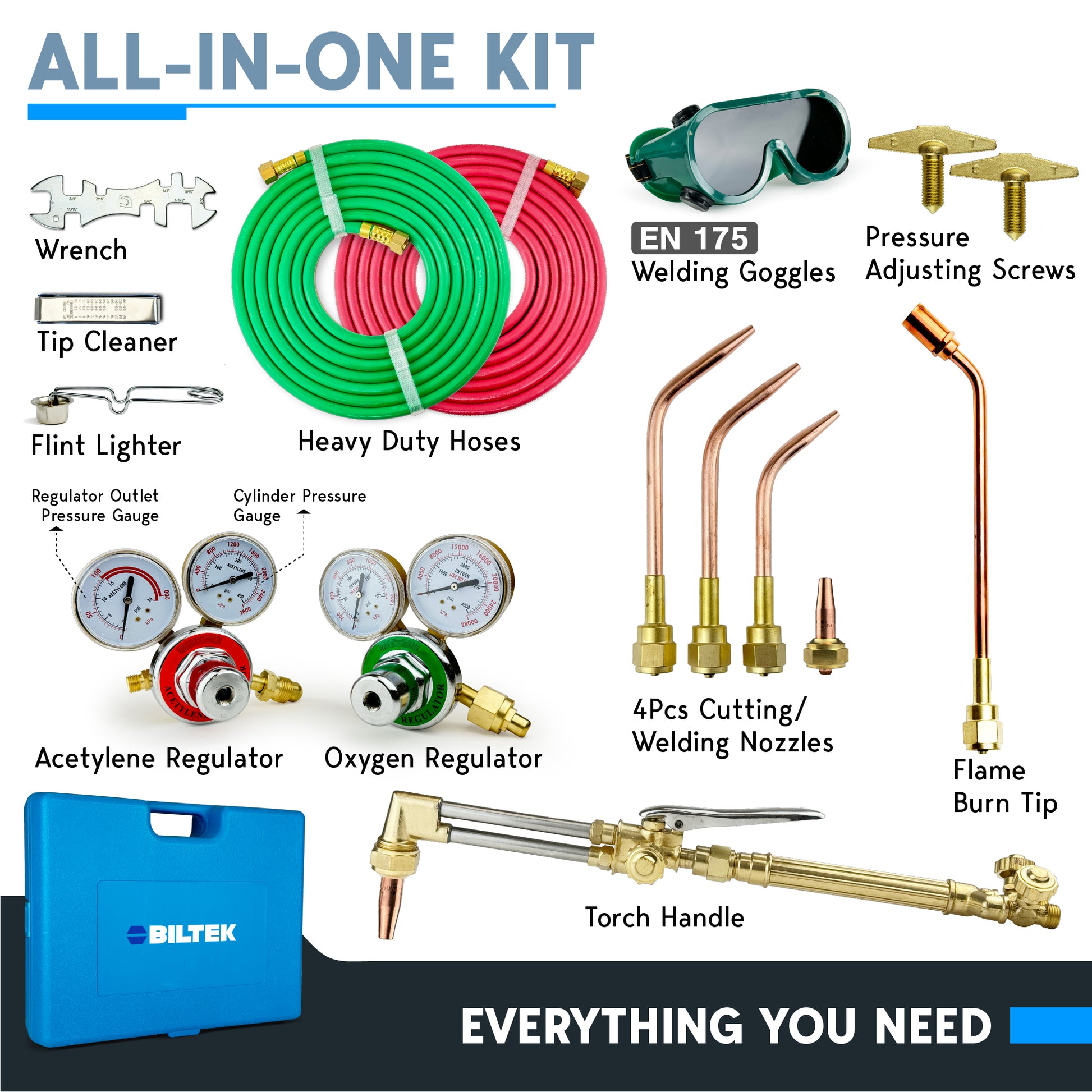 - [ALL-INCLUSIVE TORCH SET] - BILTEK's oxy acetylene torch kit is a 15-piece kit including a torch handle, oxygen and acetylene regulator, adjusting screws, 1 cutting tip, 3 welding nozzles, oxygen and acetylene hose, welding goggle, spark lighter, wrench, and tip cleaner. All the accessories come in a heavy-duty plastic blow-molded case for easy storage and transportation. Whether you are an amateur or a seasoned professional, this torch kit allows you to cut, weld, and braze with efficiency.