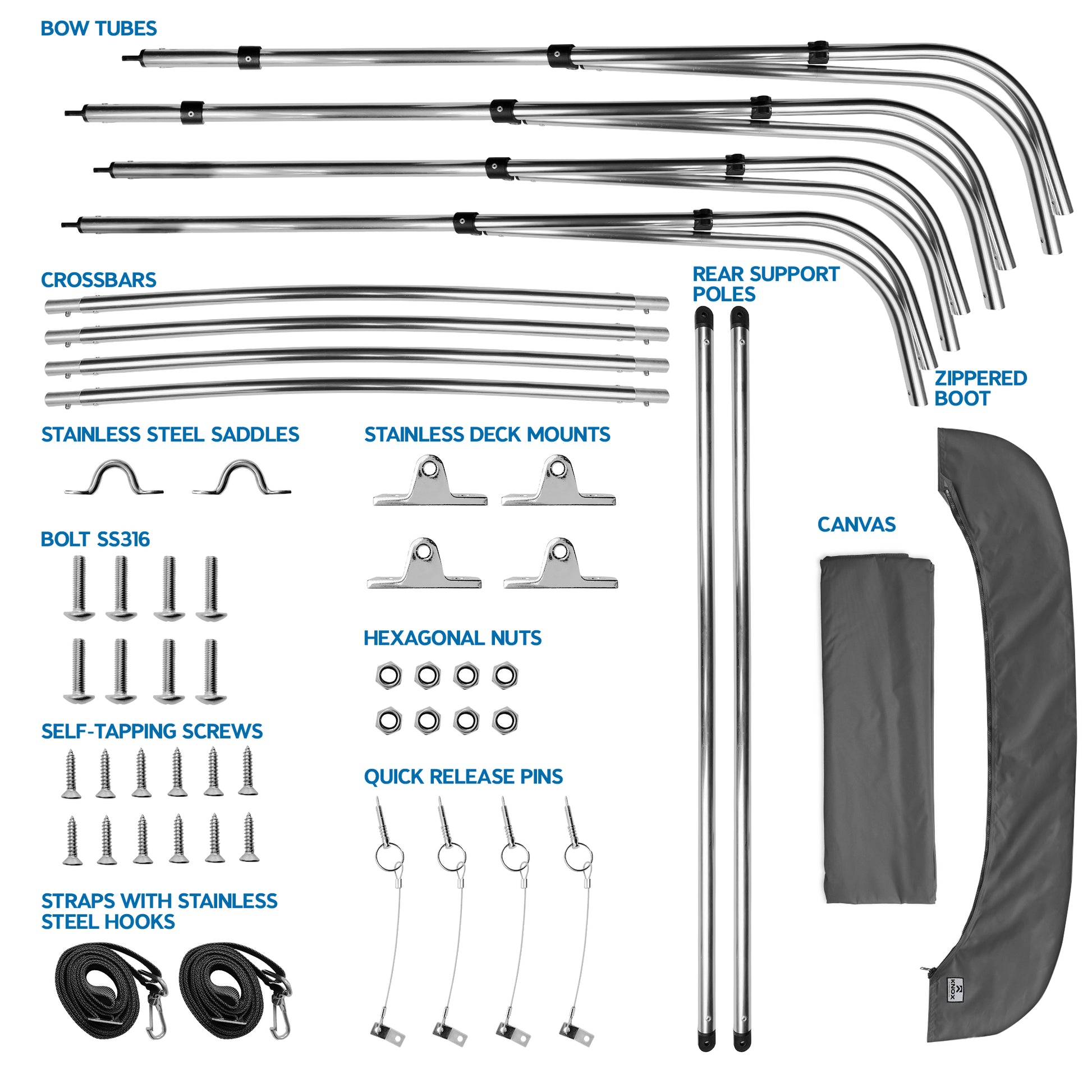 - [STAINLESS STEEL HARDWARE BUILT TO LAST] - We've upgraded our 4 bow Bimini top for boat kits to comprise of premium quality Bimini top support poles and stainless steel mounting hardware, like deck mounts and quick release pins.