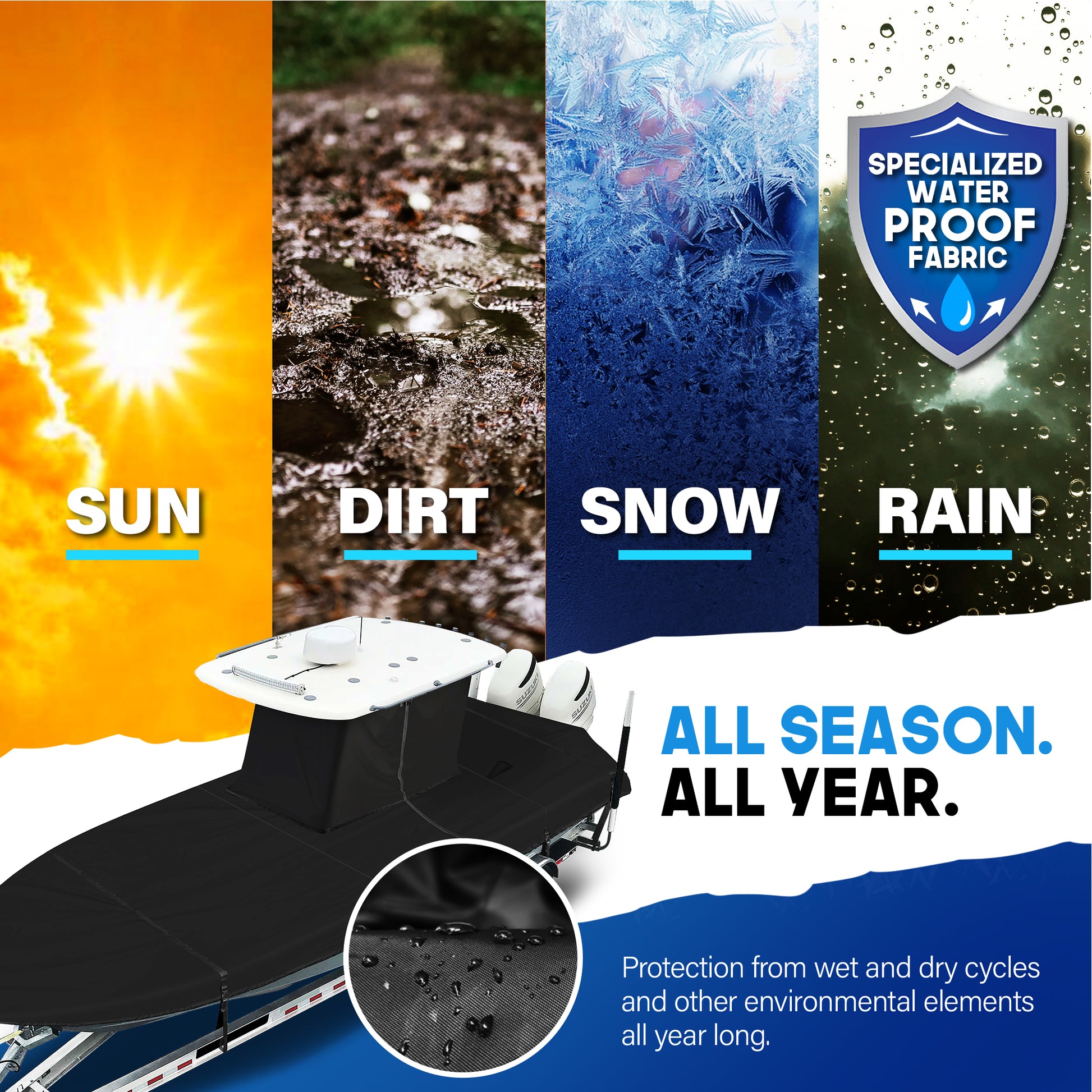 - [WATERPROOF & UV RESISTANT] Our boat cover is coated with a water-repellent material and made with heavy-duty, breathable fabric that provides superior waterproof protection.