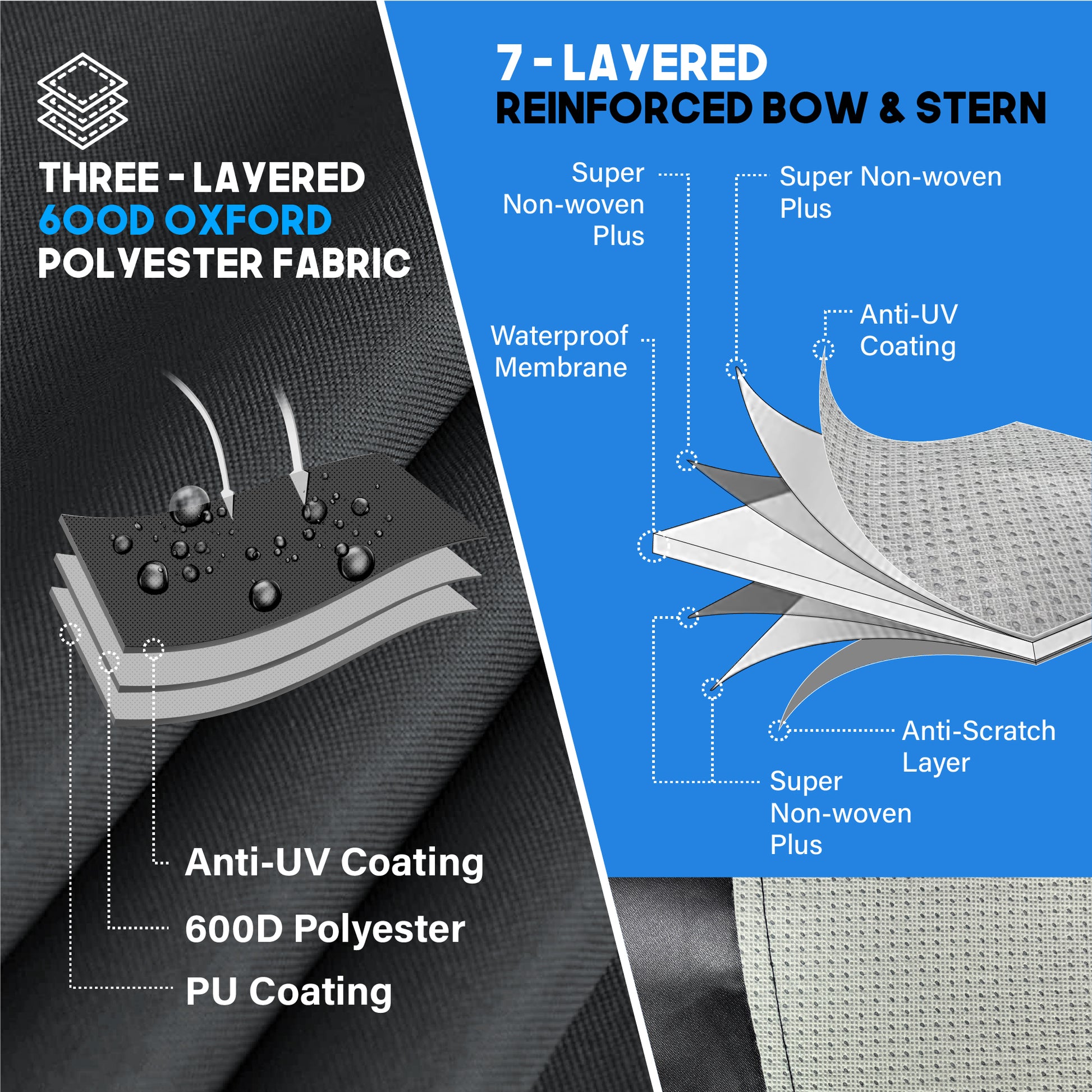 - [MARINE GRADE FABRIC] Our boat cover is constructed from heavy-duty, double-layered 600D Oxford polyester fabric, which is highly durable and long-lasting.