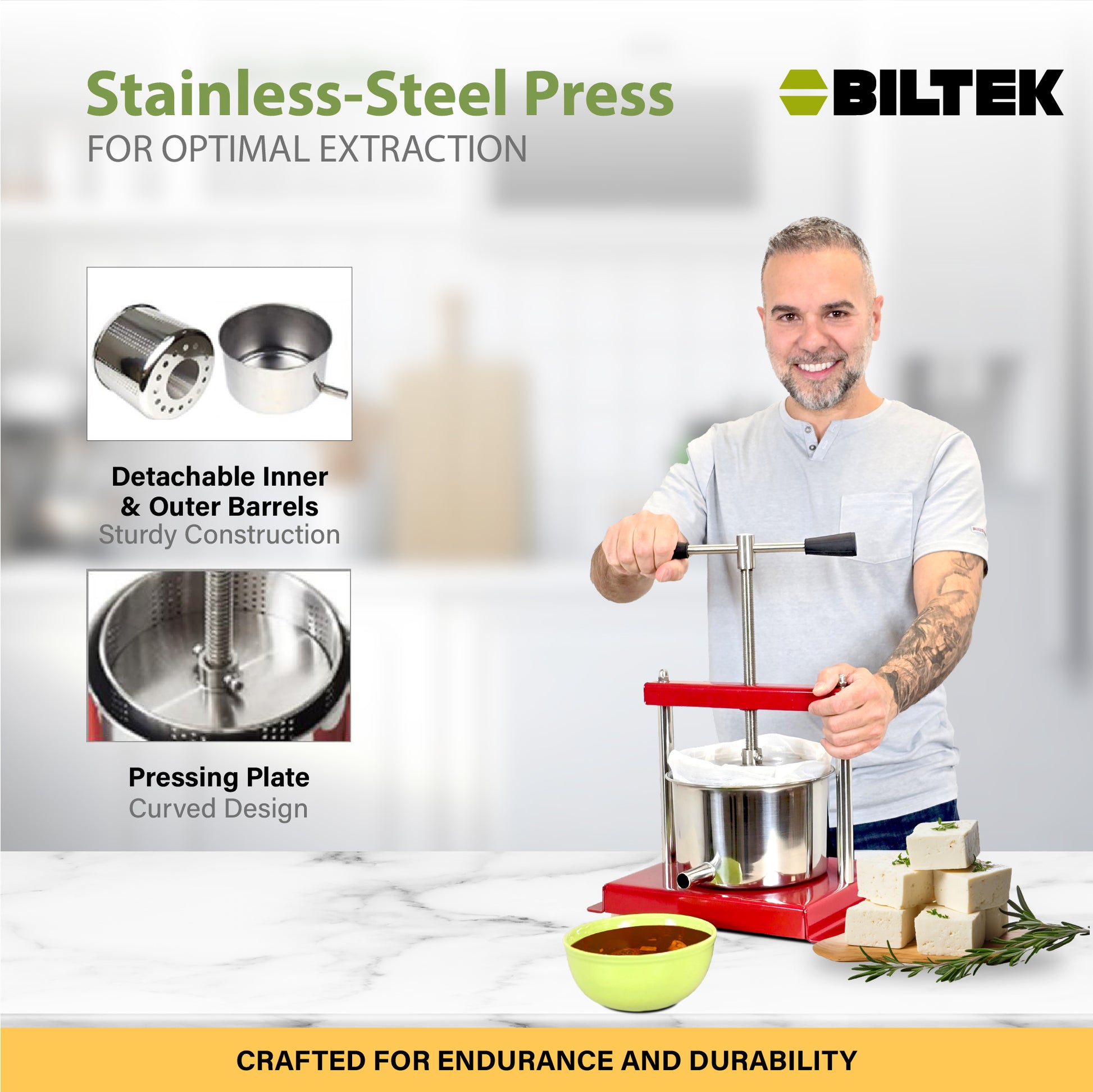 - [PERFECT FOR TINCTURES, HERBS, CHEESE, NUT MILK, & MORE!] - Biltek's cheese press for cheese making is essential for making homemade cheese, tinctures, herbs, nut milk, & more. This olive oil press is also perfect for enjoying freshly pressed wine, cider, or other fruit juices daily.