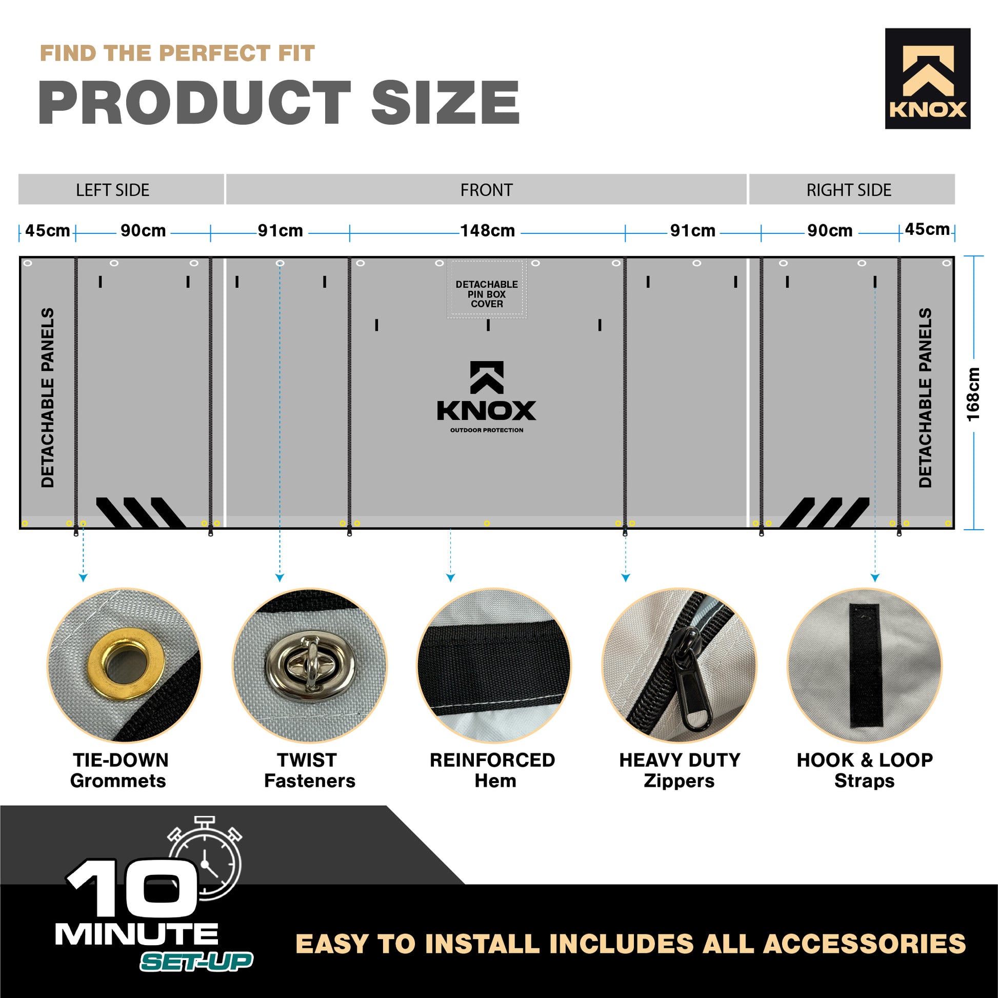 - [RIP-RESISTANT TWIST FASTENERS] - Experience unmatched durability with the KNOX 5th Wheel Skirt featuring twist fasteners that surpass competitors' easy-to-rip button design. These fasteners stay firm and sturdy, until released, ensuring longevity.