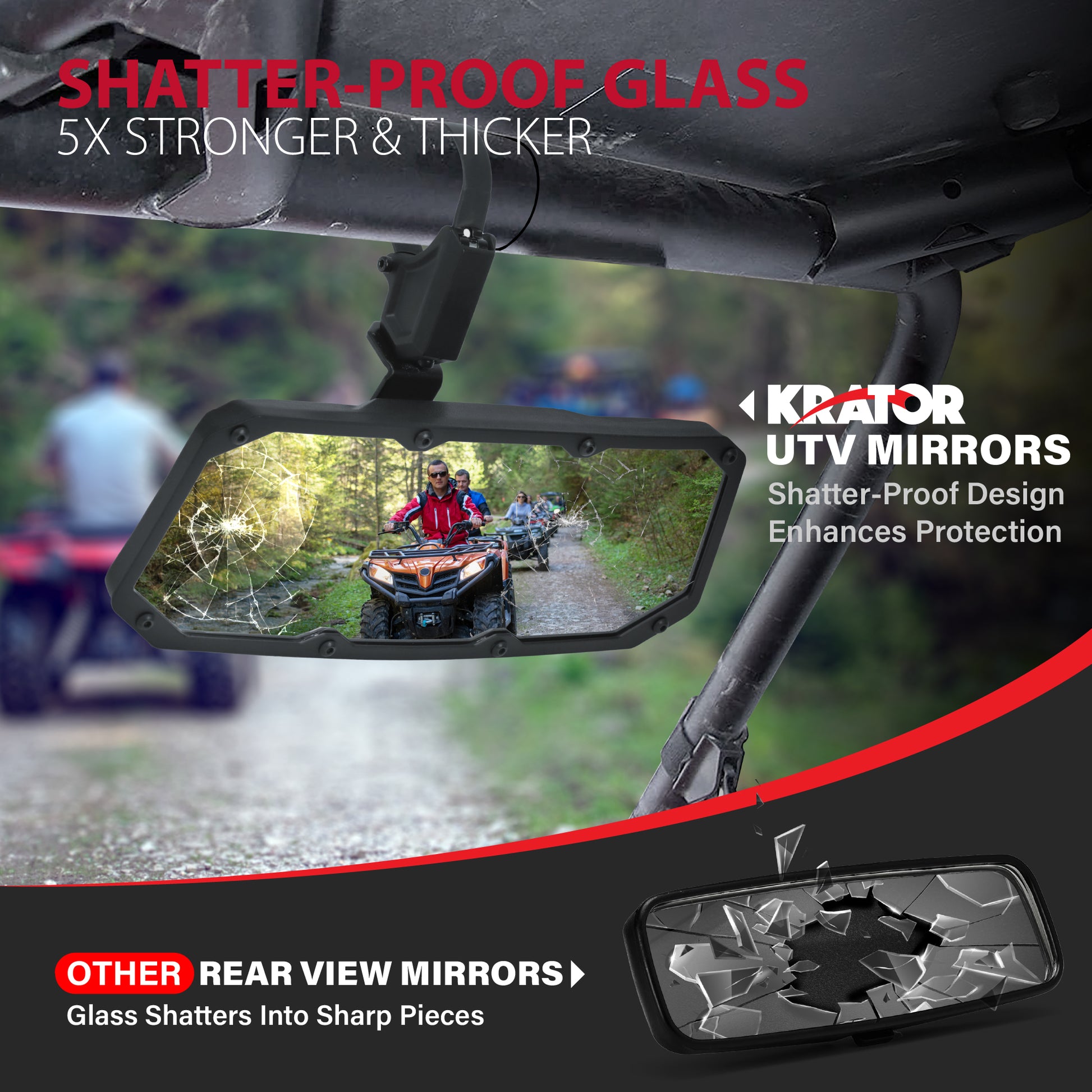 - [SCRATCH-PROOF & SHATTERPROOF GLASS] - Krator UTV rear view mirror is made with tempered glass which is five times stronger & thicker than standard glass mirrors. The mirror features a shatter-resistant surface that breaks into a web of blunt fragments. The scratch-proof design shields your mirror from gravel, debris, and other elements during muddy or dusty rides. The smooth edges and a no-fingerprint surface ensure a clear view, reducing distractions and providing a better driving experience.