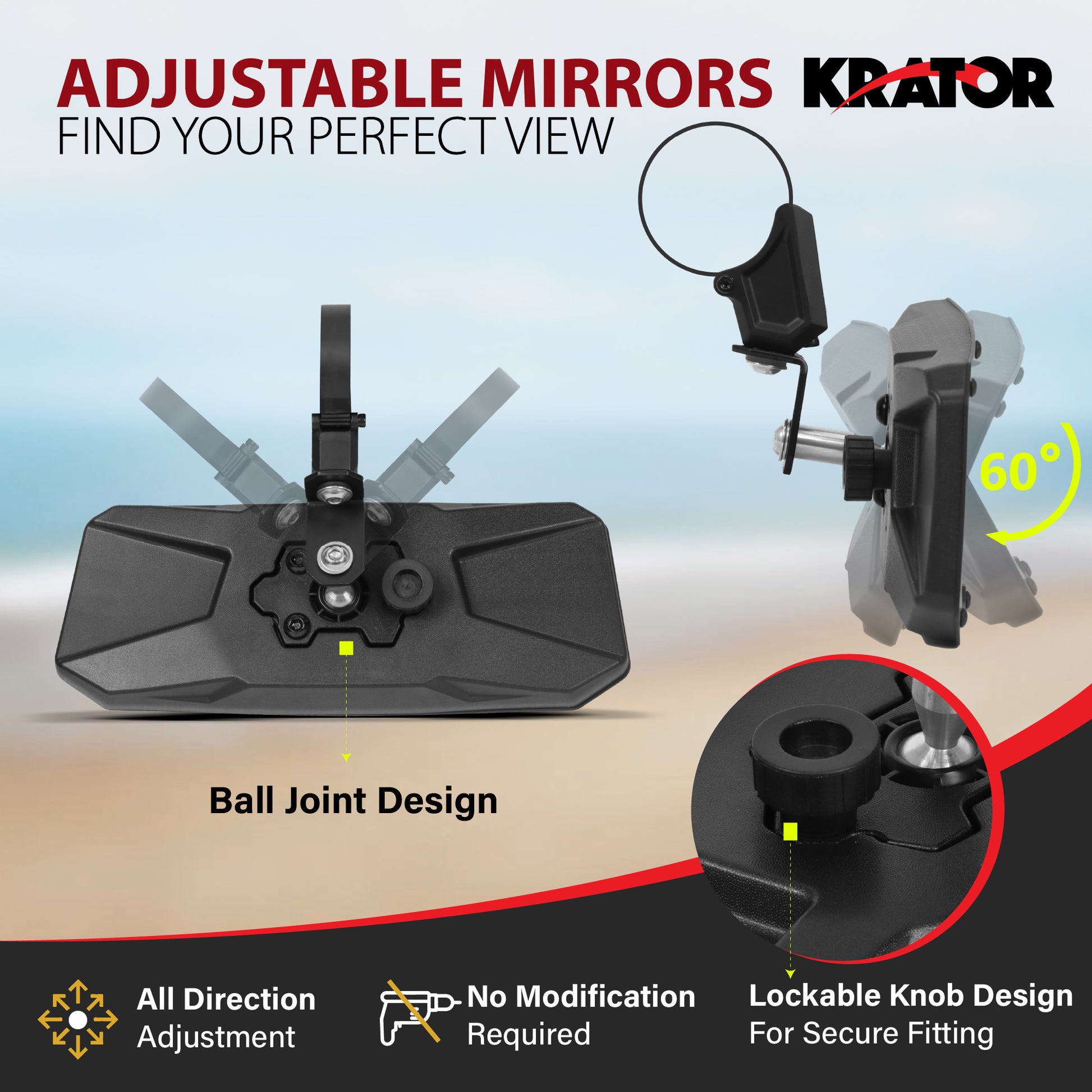 - [360-DEGREE ADJUSTABLE & LOCKABLE KNOB DESIGN] - This UTV mirror rear allows for easy adjustment, reducing vibration & providing a customizable angle. Install in minutes, this mirror locks securely with the knob & prevents any movement. Adjust the mirror in any direction���up, down, left, or right���without extra tools. No drilling or modifications required. Experience the ultimate flexibility with our 360-degree adjustable UTV rear view mirror mount.
