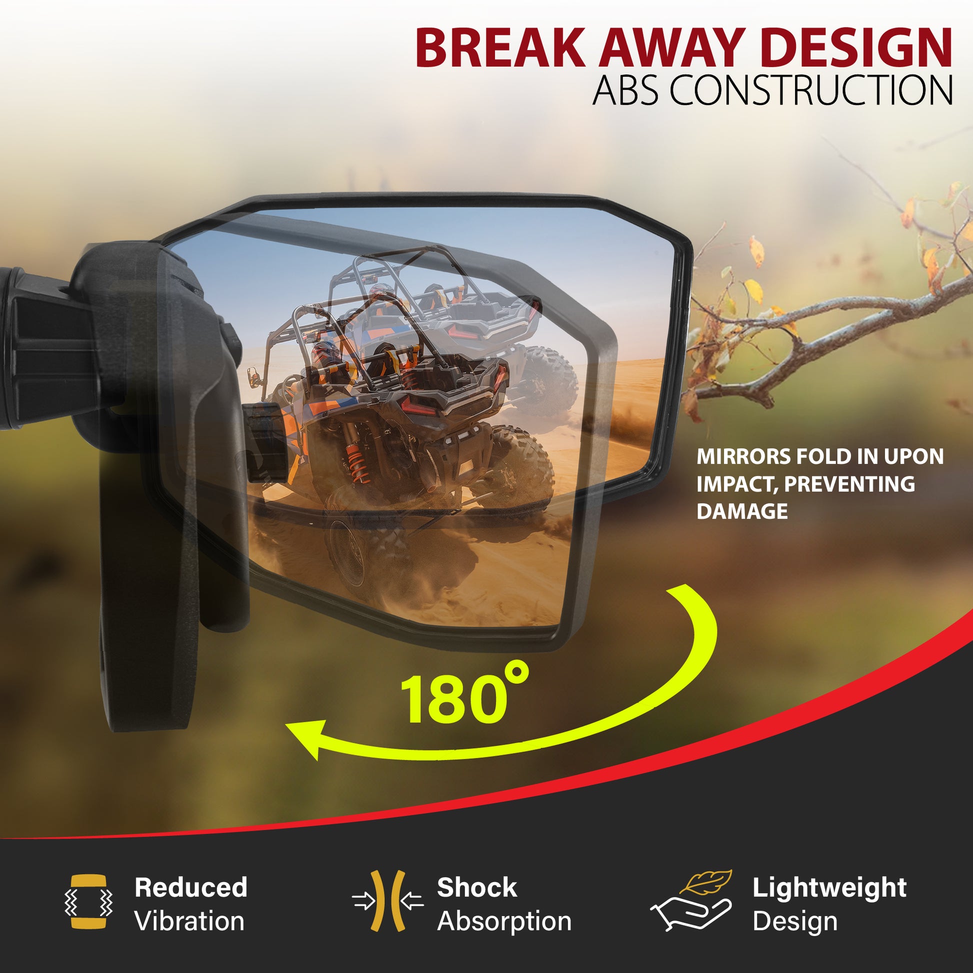 - [MOVE FREELY WITH BREAKAWAY MIRRORS] - Built to tackle every terrain, Krator���s UTV mirrors are equipped with a breakaway feature. This intuitive design allows you to fold the mirrors in when going through tight places, preventing impact to the mirror glass. It also gives our mirrors reflex sensitivity to all surroundings, folding in on their own if your UTV bumps against rocky edges or branches. High impact resistant ABS housing ensures the side mirrors do not vibrate on rough off-road trails.