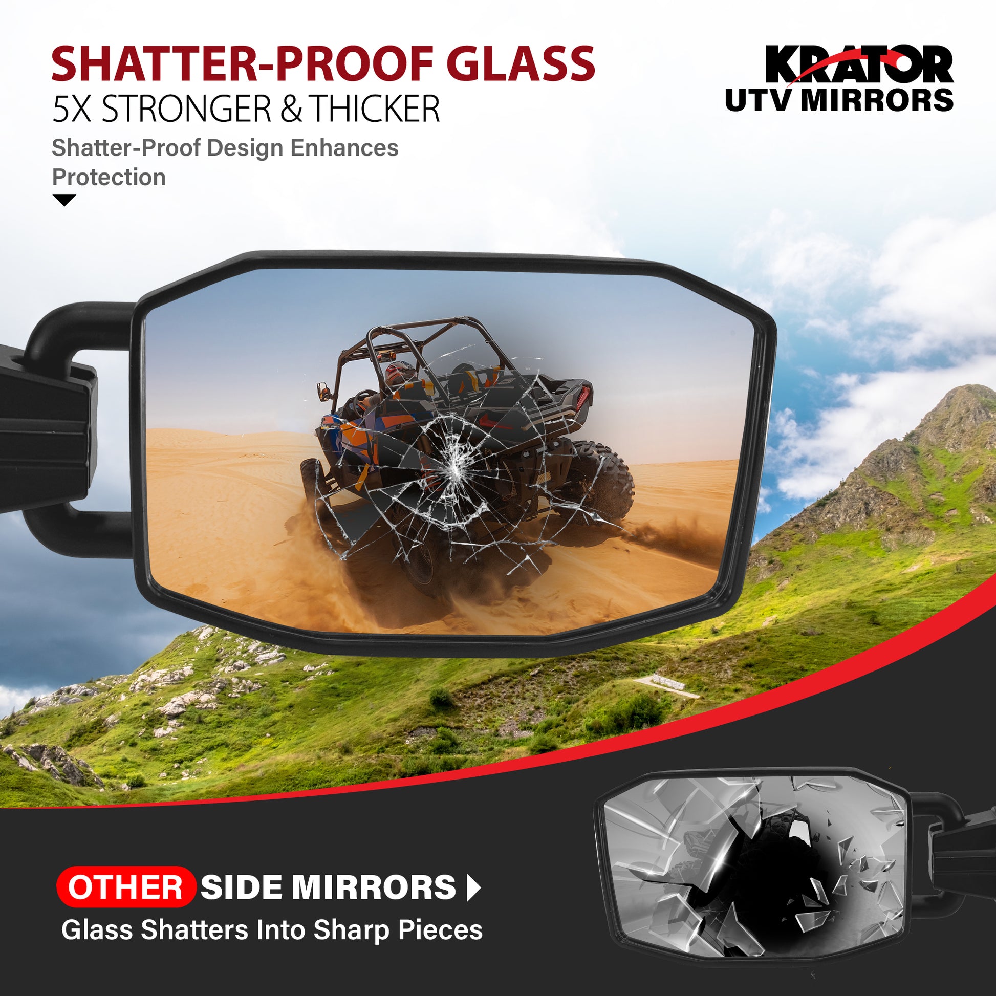 - [TEMPERED GLASS THAT LASTS] - When you add Krator���s side by side mirror set to your UTV accessories, you get top-quality tempered glass and superior visibility that lasts for years. Tempered mirror glass is five times stronger and thicker than standard glass mirrors. Tempered glass cannot be altered by dirt, scratches, or fingerprints, ensuring perfect clarity in all conditions. It withstands high temperatures, whereas standard glass often warps and breaks when exposed to direct sunlight and heat.